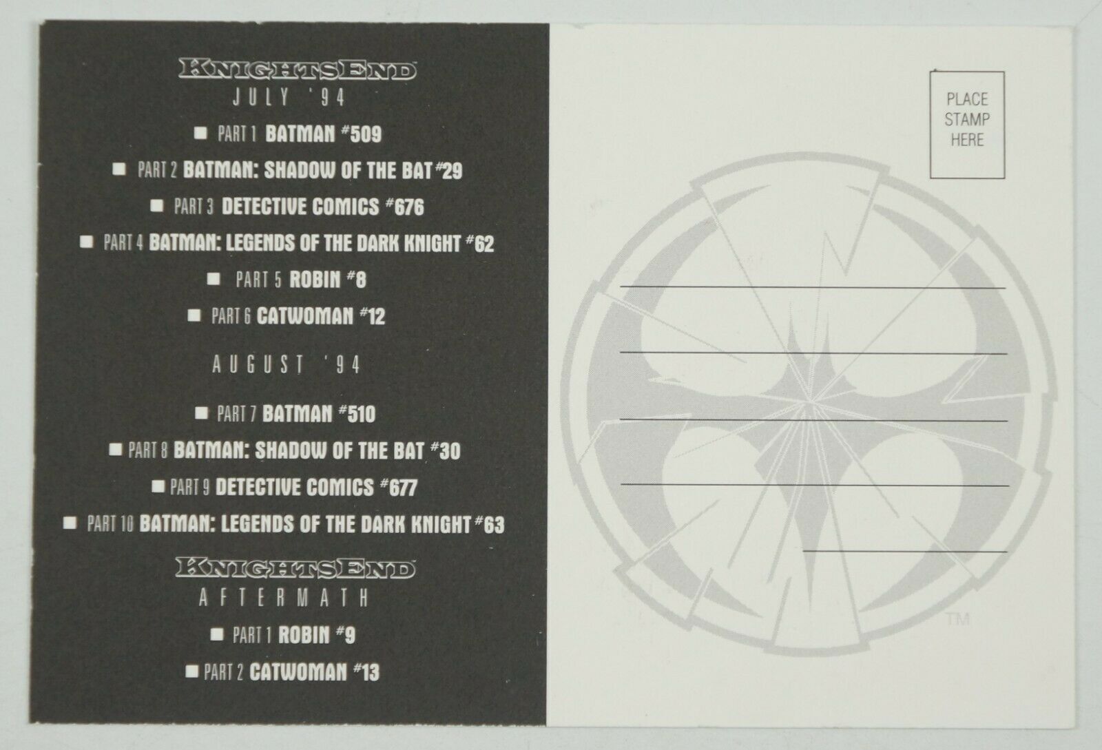 Item: KnightsEnd promotional postcard Date: 1994 Other Info: Featuring the art of Graham Nolan Inventory Code: 0024-MIS Terms & Conditions * Shipping * Comics are sent in a bubble mailer sandwiched between tw ... Read More