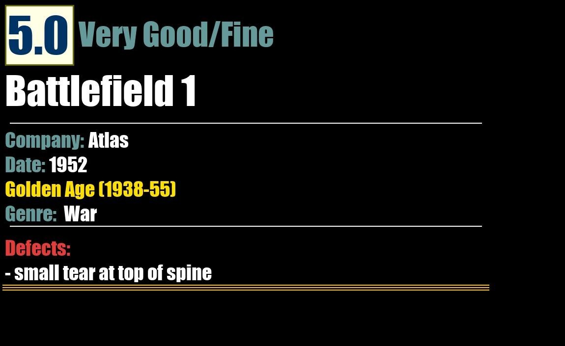Grade: 5.0 Very Good/Fine Shipping may take up to 5 business daysBattlefield 1Atlas - 1952WarGolden Age (1938-55)5.0 Very Good/FineDefects:- small tear at top of spine