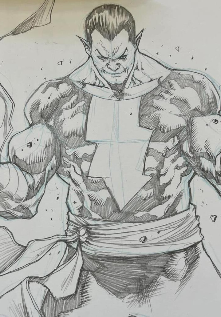 Original Black Adam pencil sketch by Sergio Dávila, focusing on raw physical power and controlled aggression.This drawing highlights Dávila’s anatomical precision, with thick, sculpted musculature and a tight, impos ... Read More