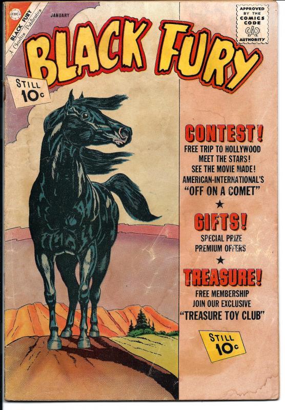 Black Fury, Vol. 1, No 34, January, 1962. Very Good. (Selling this one for only 5.95).Cover by Ernie Hart. Stories by unknown. Art by Rocke Mastroserio and Bill Molno. Featuring Black Fury in "The Legend of the Shining Horse" and "Killer's Return"! Plus: back-up story "Frontiersman"! And: 1-page historical filler "Tombstone of Life"! Also: 2-page text story "Gregory's Diggings"! 32 pages, full color.
