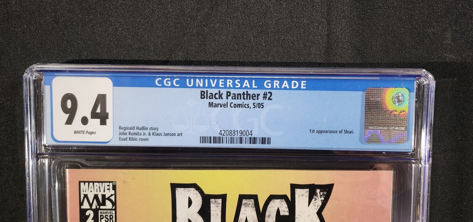Black Panther #2 - 1st App Shuri / Esad Ribic Cover (CGC 9.4) 2005Size: 8" x 13"This item was uploaded by __LM__.If you have any specific questions or requests, please ask us prior to ordering and we'll get back to you as soon as we can. If there are any problems with your order whatsoever, please message us before leaving feedback and we'll be happy to work with you to fix the situation!We ship worldwide, combine purchases, and charge exact shipping. The price may vary based on size, weight, and location. If you are automatically overcharged for shipping, message us and we'll be happy to revise the invoice or refund you the excess amount. If you have any questions regarding shipping, please message us.International Buyers - Please Note: Import duties, taxes, and charges are not included in the item price or shipping cost. These charges are the buyer's responsibility. Please check with your country's customs office to determine what these additional costs will be prior to bidding or buying. Payment can be made by PayPal and credit cards directly.120,000+ items in total in my Hip store! Frequently Asked Questions: When are your operation hours? Our in office hours are Monday - Friday, 11 am - 8 pm. We are not open on weekends, so if you send us a request on Friday evening we won't get back to you until Monday afternoon. Please don't take it as us ignoring you! We will work on your request Monday and get back to you as soon as we can. Also, if you order from us on a Friday evening or Saturday morning we won't start processing your order until we open on Monday. That means on Monday it will be pulled and prepped for shipping, then picked up by the postman on Tuesday morning. When will you ship my item? The tracking hasn't moved. We realize you're eager to get your item, so if the tracking hasn't moved in a few days please don't be concerned. We give the postman a lot of packages daily, sometimes as many as 100, so he does not scan each item for us upon pickup as he says it would be too time consuming for him to do so. If you get a tracking number from us, that almost always means your item was picked up by the postman the next business day. The USPS is also imperfect. There are times when the tracking won't even show movement until it's in your area's regional distribution center. This is normal in our experience. Is the item pictured the exact one for sale?Yes! We don't use stock images and go through great lengths to photograph everything we list. The item pictured is exactly what you should receive UNLESS it is a fixed price listing with multiple items available.Have these CGCs had any previous owners? No. I have personally sent in almost all of these to CGC and had them returned to me, offering them fresh to the market for the 1st time. What is your base shipping for CGC comics? Domestic for CGCs are $10 for the first and $5 for each additional one you add. How do you ship comics?We ship in rigid cardboard mailers to protect your comic book from the worst the mail system has to offer. Price varies based on the number of books you purchase, but we try to keep costs as low as we can and charge exact shipping. If it looks unusually high to you please send us a message and we'll be happy to double check for you. Do you combine shipping? Yes, of like items. Such as: several comics can fit in one cardboard mailer, as can more than one record. Multiple art pages can easily be combined because they are light and thin. Where combined shipping differs is with size and weight. For instance, two statues require a much bigger box. Same goes for CGCs, as the package gets bigger and heavier as you go. Do you ship well? I've had some bad experiences... You needn't worry; we are professionals who value your business and want your item to arrive safely as much as you do. I have been collecting for over 30 years. I send out items the way I would like to receive them. The tracking says my item is "OUT FOR DELIVERY" in New Jersey. Why is that?If the tracking indicates that the item is "OUT FOR DELIVERY" in NJ don't worry, it's just what the tracking says when it's carried over from the postman to the sorting center. This is normal for our Post Office and will not impact you receiving your item in a timely matter.I changed my mind after successfully winning the auction or fixed price listing, will you cancel the transaction? Please only bid or hit BUY IT NOW if you are willing to follow through and pay for the item, we will not cancel the transaction. As a seller, Hip penalizes us every time we cancel an order, so it is detrimental to our business to do so. Therefore if you will not pay, then you'll have to let Hip cycle this to an "unpaid item" and accept whatever action Hip deems necessary. 120,000+ items in total in my Hip store! AS SEEN ON TV I have been buying and selling artwork and comics for about 20 years. The artwork pictured are all one of kind originals unless otherwise described. If you are new to buying art feel free to ask any questions that you may have. 120,000+ items in total in my Hip store! Small, Regular, and Large Portfolios available; see my Hip store!