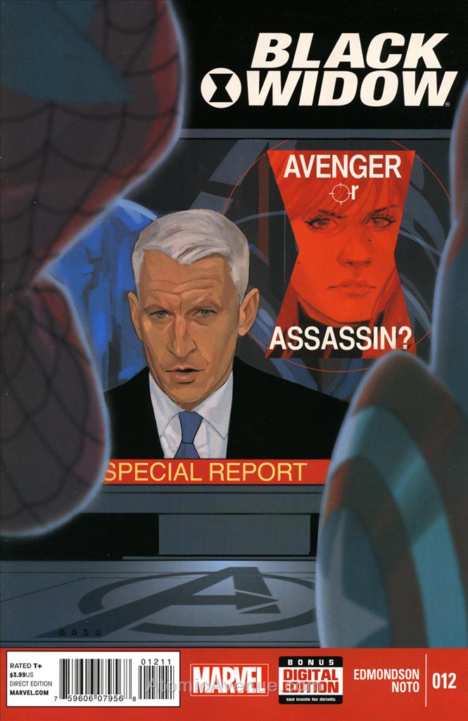 Item: Black Widow (5th Series) #12 | Publisher: Marvel | Cover Date: January 2015 | Writer: Nathan Edmondson | Artist: Phil Noto | Cover Artist: Phil Noto | Appearances: Avengers, Captain America (Sam Wilson), Hawkeye, Iron Man, Spider-Man, Black Widow, Anderson Cooper, Daredevil, Uri Friedman, Howling Commandos, Beowulf, Dirt Diver, Liho, Punisher, Rashid, Tori Raven, Isaiah Ross, S.H.I.E.L.D., Maria Hill, Spider-Woman, Winter Soldier, X-23 | Storylines: Somalia | Notes: 1st Appearance of Anderson Cooper in the Marvel Universe; 1st Appearance of Uri Friedman | With Economy shipping, each additional comic ships for just 50 cents more to customers in the USA. This listing contains a stock photo and information from ComicBase™ and © Human Computing. The stock photo is for reference only. If you would like to see a photo of the actual item, please message us prior to purchasing.Seller Information