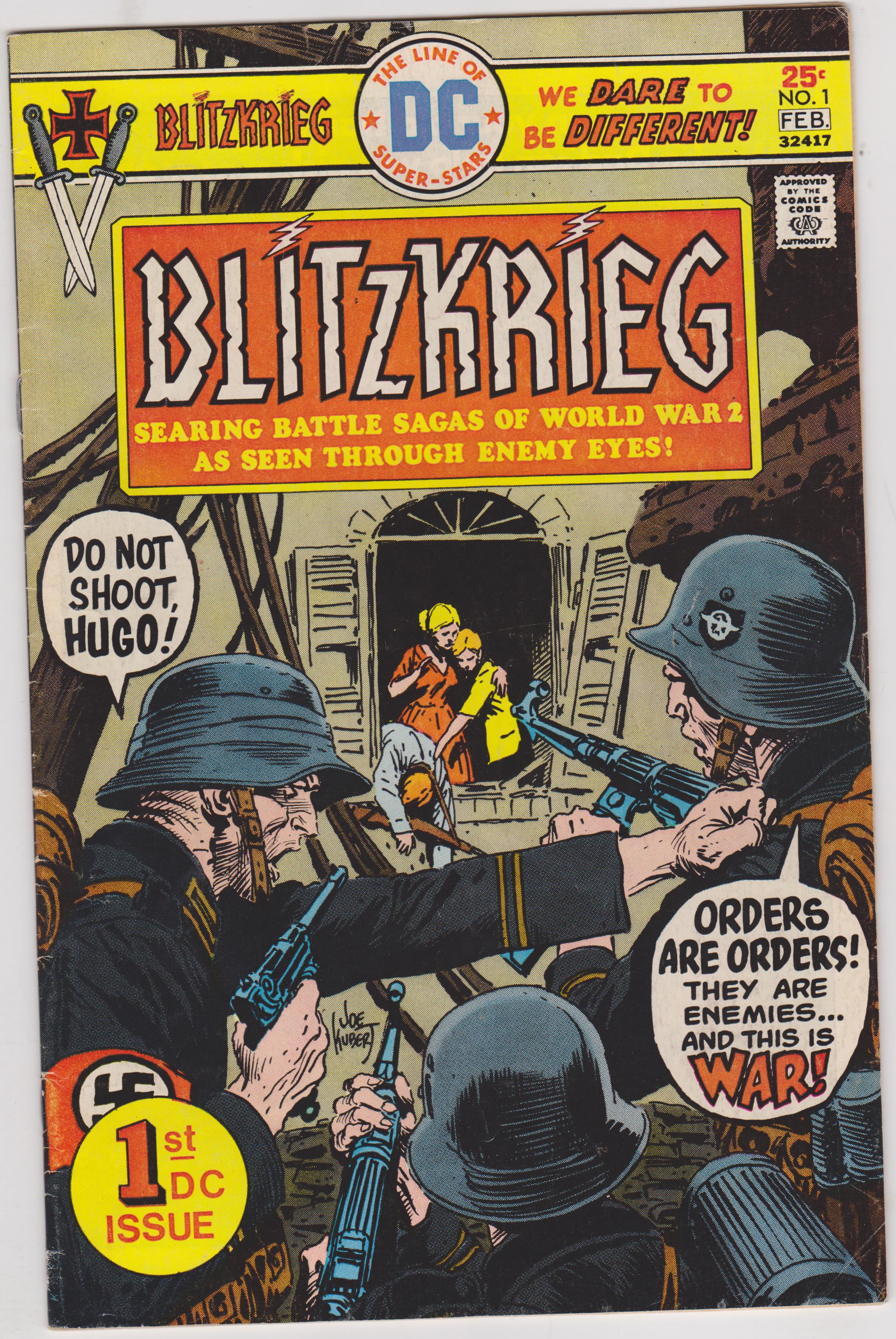 Blitzkrieg #1 by DC Comics copyright 1976. I have graded the comic book, using the Overstreet Grading Guide, at FINE with the following defects: Light stress marks along the spine. The corners are rounded. There is some yellowing of the pages.Seller Information