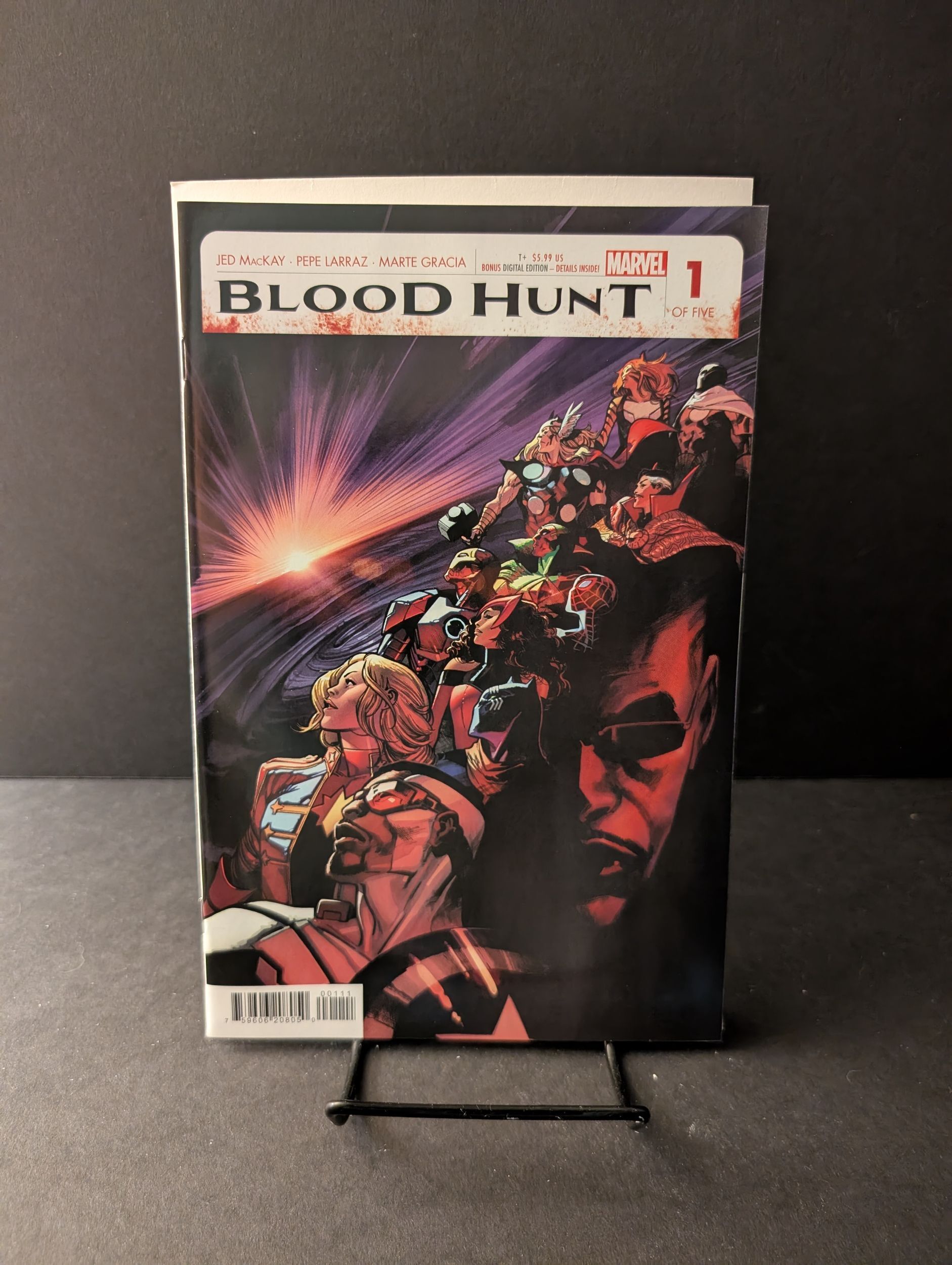 Written by Jed MacKay. Art by Pepe Larraz. Cover by Pepe Larraz. THE BLOODIEST MARVEL EVENT EVER! The skies have gone dark, the sun hiding its face from the carnage to come. The children of the night, the vampires, have risen from the dark and hidden places of the world as one to drown the Marvel Universe in blood. Earth's final night has fallen - can even the heroes of this doomed world stem the tide of blood that is to come? Join the AVENGERS, BLADE, BLOODLINE, SPIDER-MAN, HUNTER'S MOON, TIGRA, DOCTOR STRANGE and CLEA as the dance of death begins in BLOOD HUNT #1! On-Sale in May! 38 pages, full color. Rated T+ Cover price $5.99.Seller Information