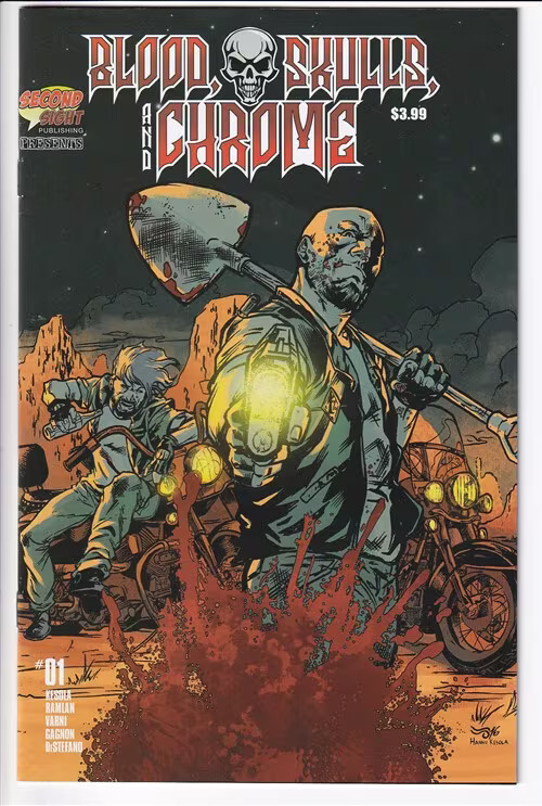 Grade: 9.2 Near Mint-Blood skulls and chrome (2021 second sight) #1 cvr a miguel angel ruiz item number: cxwh-r09730 the texas-based outlaw motorcycle club, the steel knights have lost a big deal from the mexican cartel to rival the lake street boyz gang. When the two reckless members of the mc kill the cartel's liaison, the mc soon find themselves fighting for survival against the threats from outside and within.