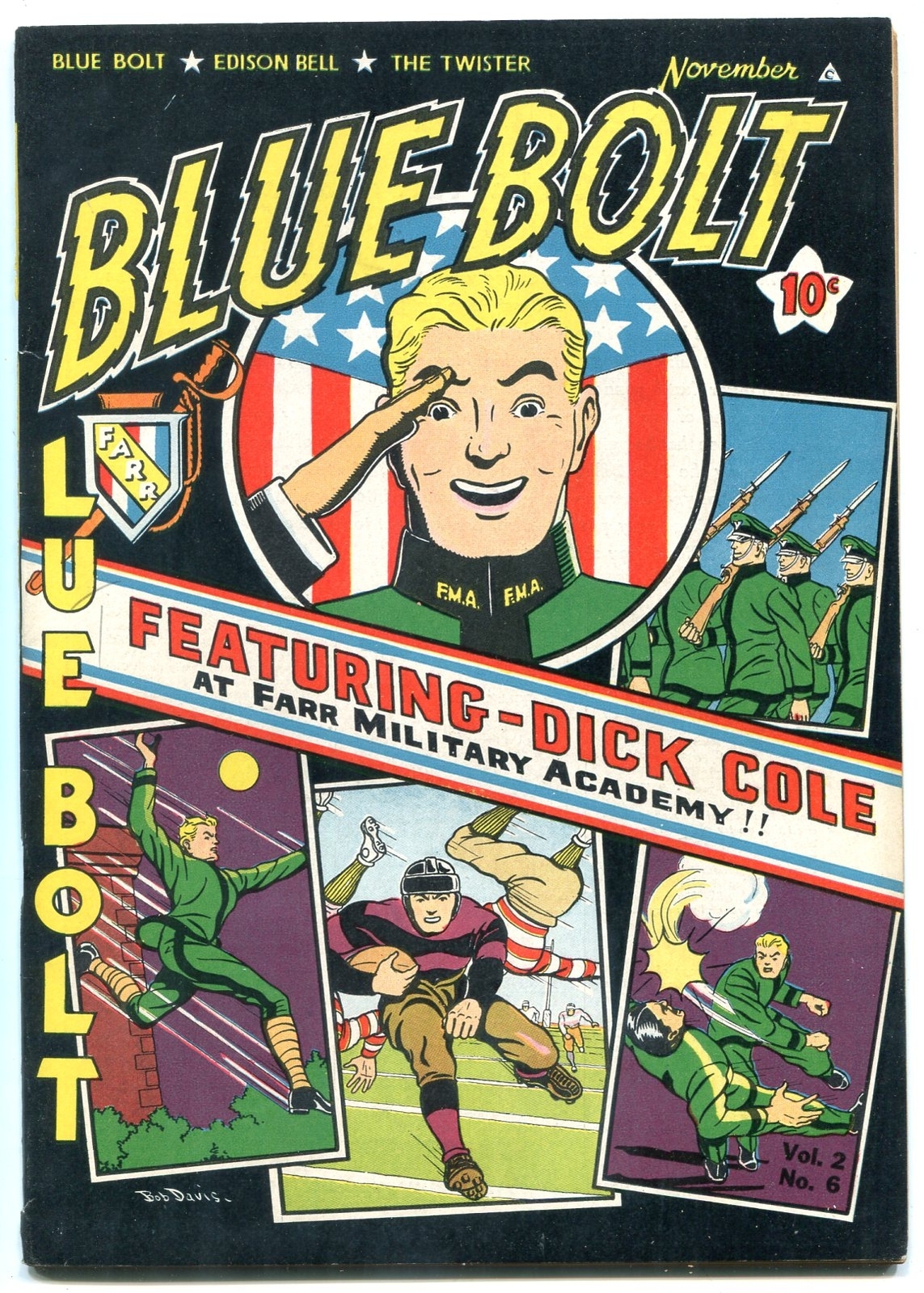 Grade: VF-Blue bolt v.2 #6 1942-dick cole---sub-zero ---twister vf- this black cover is one of the best of the series - sub-zero, sgt spook, white rider & super horse issue. Glossy cover, looks almost nm but has slight flaking on exterior page edges. This is minor. Small paper separation at bottom spine. Grade: vf- sku: do-07-007