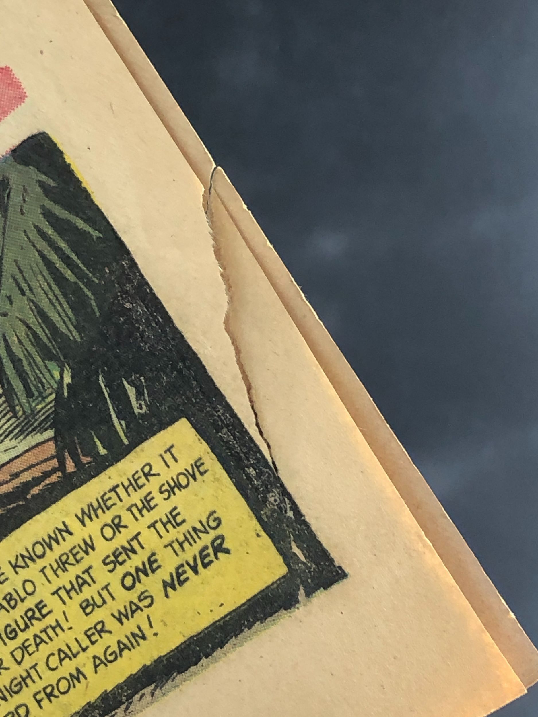 Tears and piece of cover in missing. Amazingly cover is still attached at bottom (from backside). See pics.