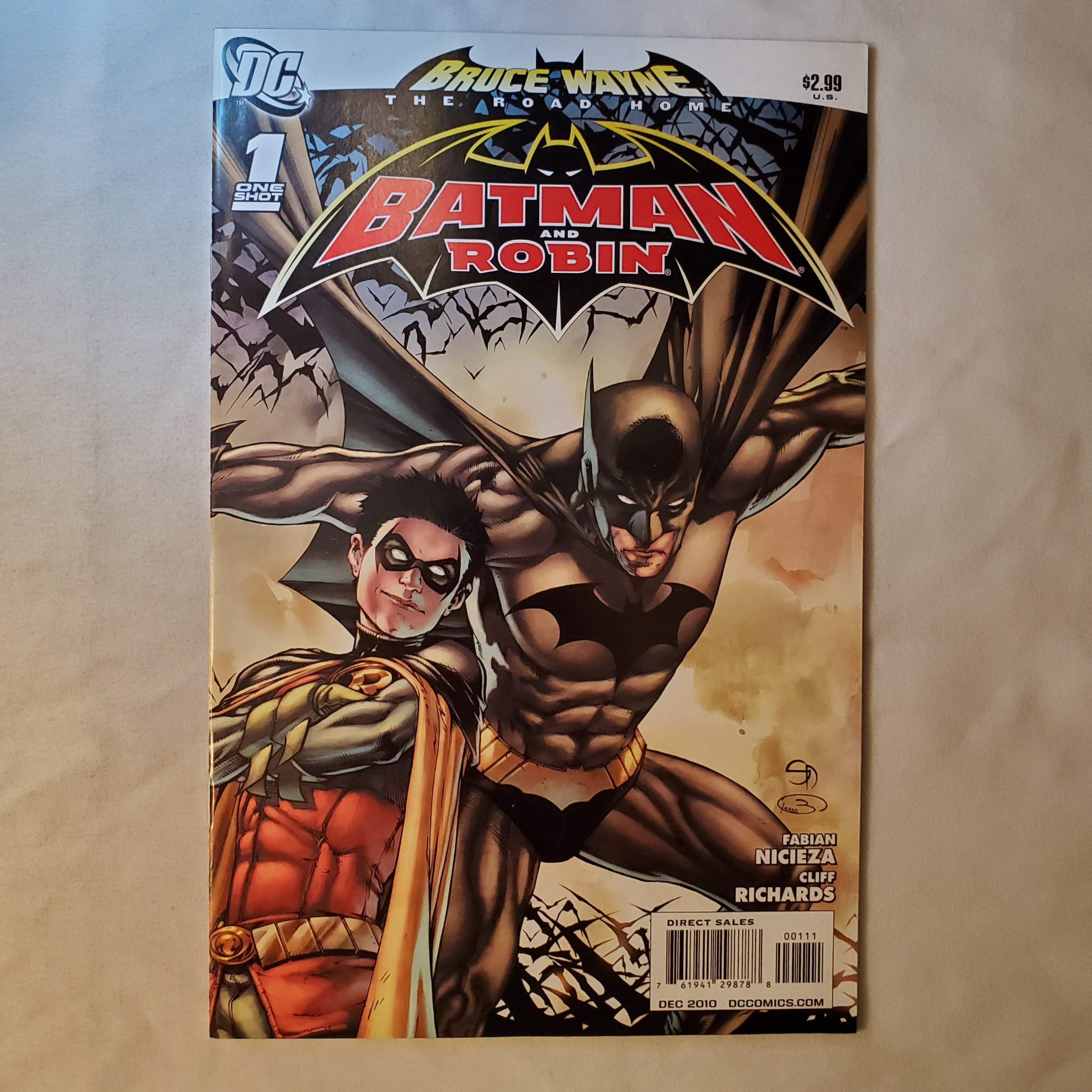 Bruce Wayne The Road Home: Part 1 - Written by FABIAN NICIEZA Art by CLIFF RICHARDS Cover by SHANE DAVIS BRUCE WAYNE - THE ROAD HOME kicks off here as Dick Grayson and Damian Wayne rush to quash a damaging news item that could threaten the secret identities of the entire Bat-family! And as if that weren't enough to occupy their time, their father figure, Bruce Wayne, has returned... 32 pg, FC Cover price $2.99.Seller Information