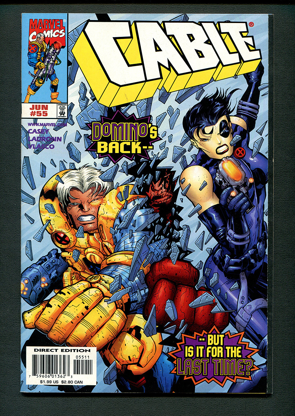Cover pencils by Jose Ladronn, inks by Juan Vlasco. Wiser Times, script by Joe Casey, pencils by Jose Ladronn, inks by Juan Vlasco and Keith Aiken; Cable sets up shop in Hell's Kitchen; Irene finds Cable eating in a diner flirting with a waitress; Domino and Cable break things off. 38 pgs