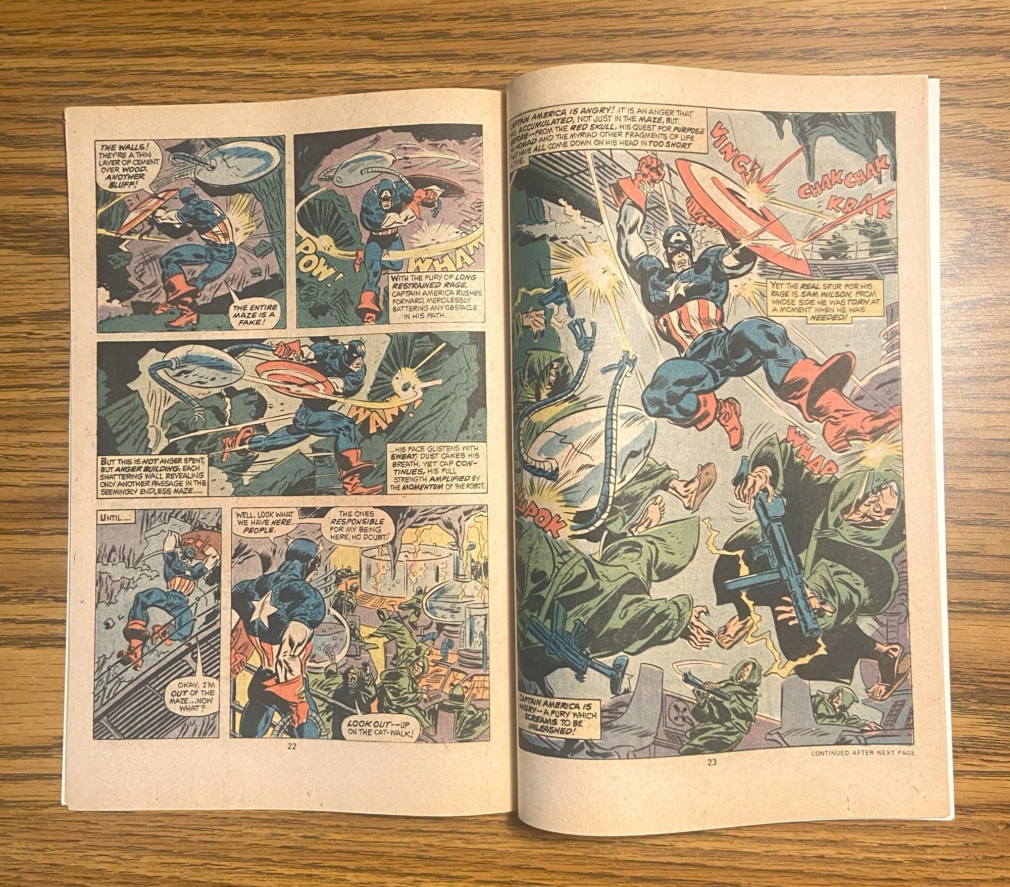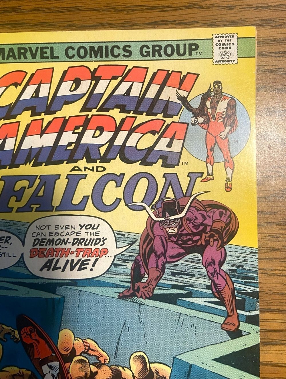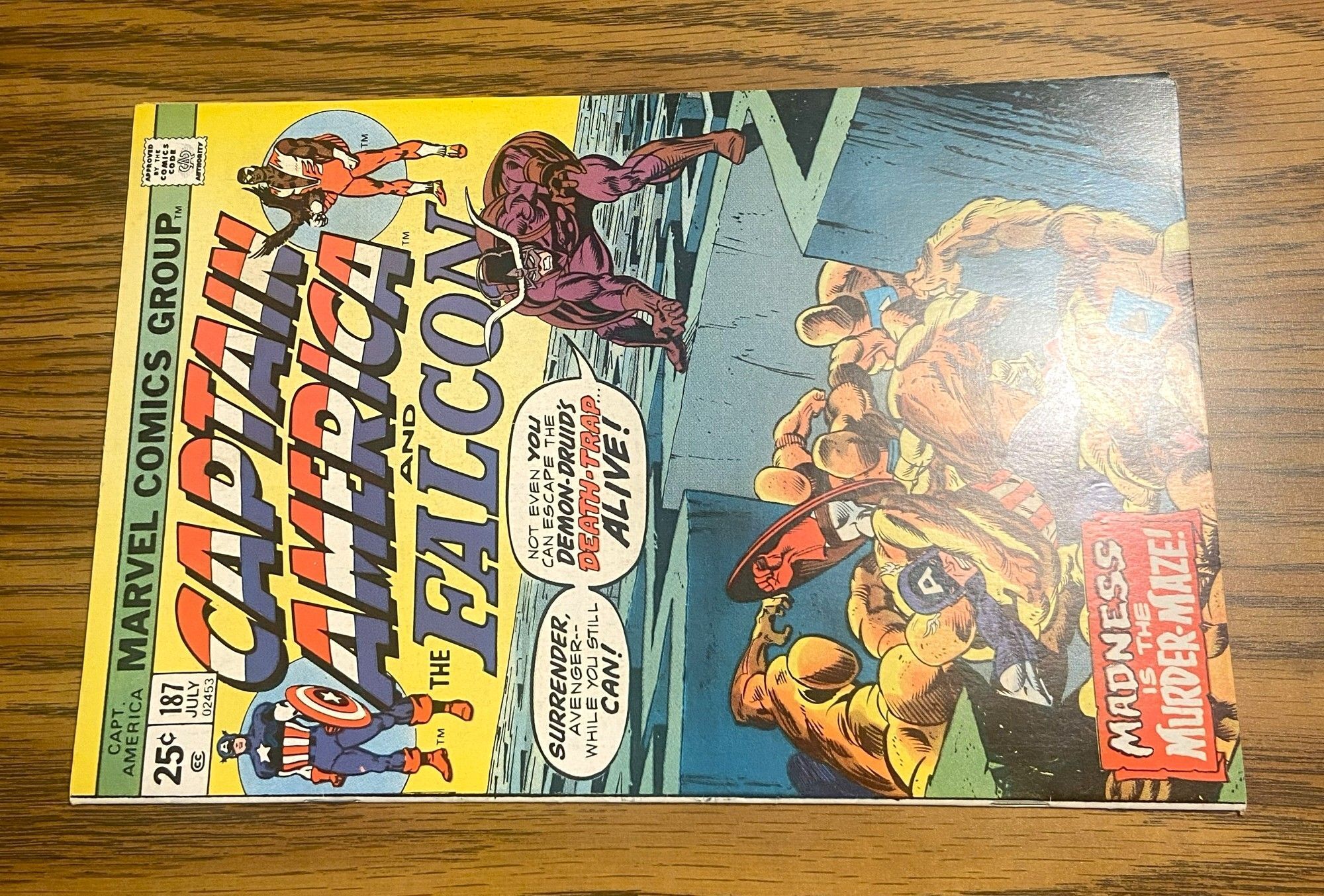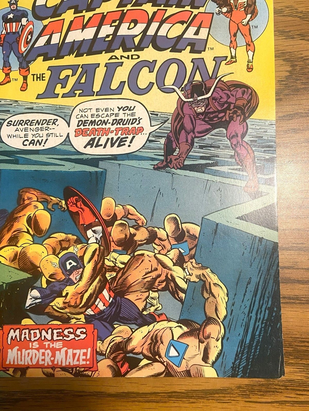 * "The Madness Maze!" Part 1 of 2. Script by John Warner. Pencils by Frank Robbins. Inks by Frank Chiaramonte. Cover by Gil Kane (pencils) and John Romita Sr. (inks). The battle vs. the Red Skull is over. But before Captain America can check on his friends, he is abducted by a strange spacecraft! And minutes later the Sentinel of Liberty is dropped into the middle of a bizarre maze -- based upon geometric progressions of mystic symbols! Cap is completely confused! And that's just how the Druid wantshim. Cameo appearances by the Falcon, Peggy Carter, Gabe Jones, and the Alchemoid. (Notes: The Druid previously appeared in Strange Tales (1st series) 144 & 145. The letters page includes a letter from comics publisherDean Mullaney. This issue contains a full-page ad for Hostess Twinkies featuring Captain Marvel vs. Nitro.) 36 pages.