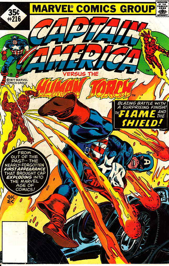 Item: Captain America (1st Series) #216A | Publisher: Marvel | Cover Date: December 1977 | Writer: Stan Lee | Artist: Jack Kirby | Cover Artist: Gil Kane | Appearances: Human Torch, Acrobat, Captain America (Steve R ... Read More