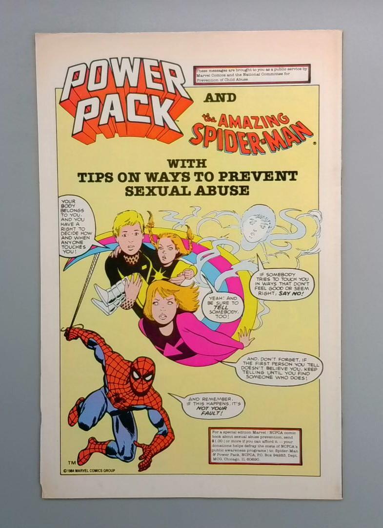 This iconic 25th Anniversary issue features Captain America in action-packed glory on the cover, with an dramatic promise that if Cap can't stop Scourge, every super-villain on the cover will die. The issue includes an important educational insert co-starring Spider-Man and Power Pack with tips on preventing sexual abuse, showcasing Marvel's commitment to public service messaging during this era.