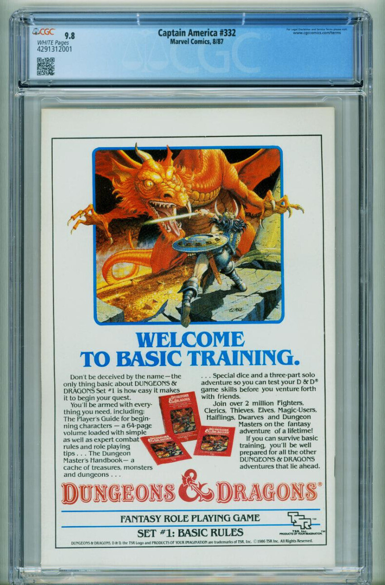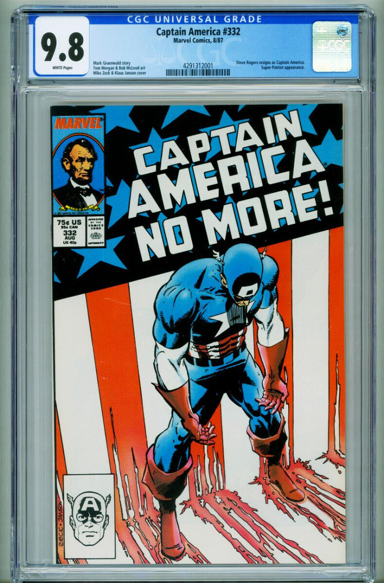 Grade: 9.8Captain America #332 CGC 9.8 1987-Steve Rogers resigns 4291312001 Steve Rogers resigns as Captain America., Super-Patriot appearance. Grade: 9.8 SKU: CK18-179