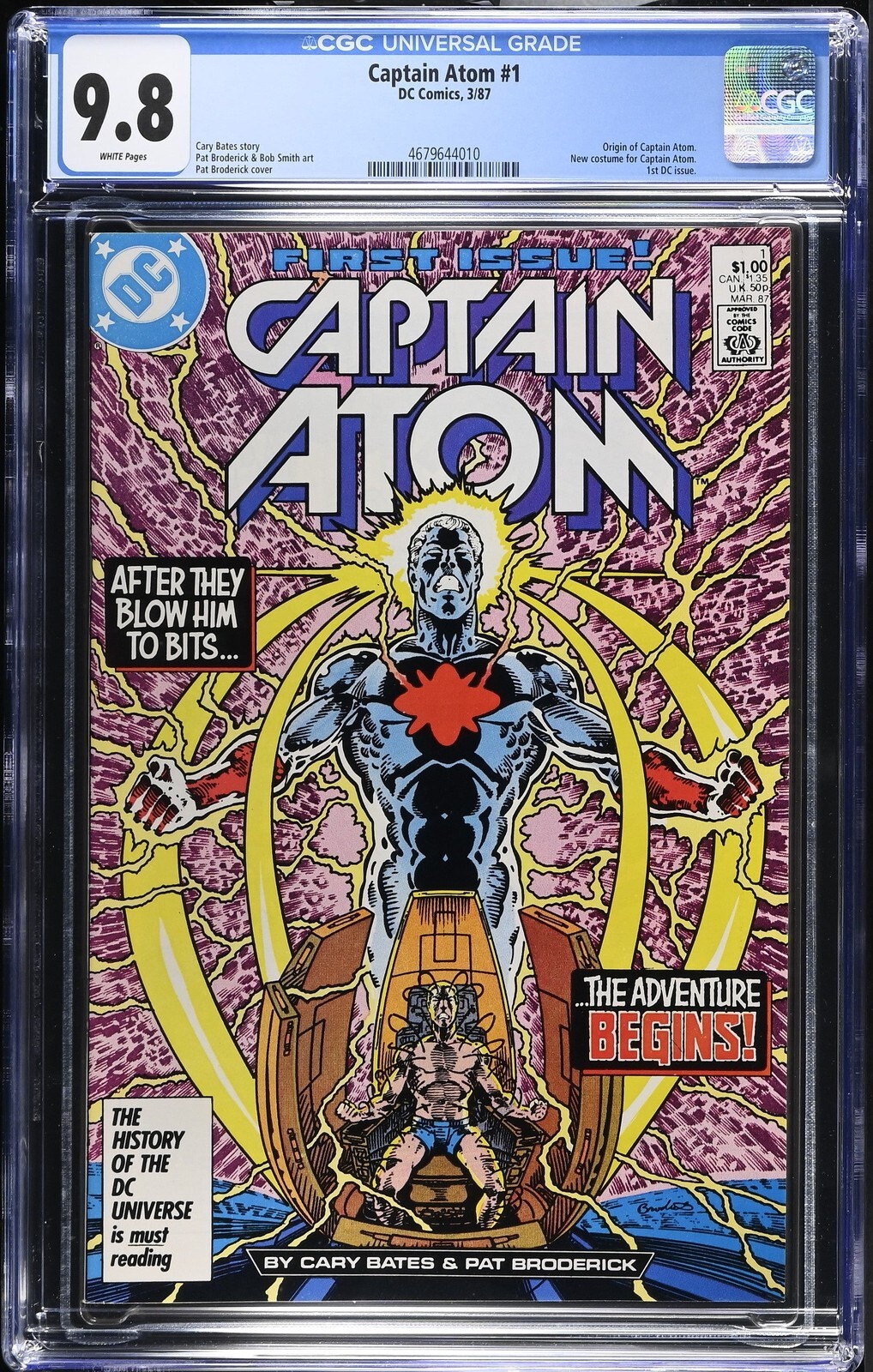 Captain Atom #1 from 3/87 offers a glimpse into the era's iconic storytelling. Featuring origin of captain atom., new costume for captain atom., 1st dc issue., this issue is a must-have for collectors. Add this CGC 9.8 graded comic to your collection today!Attribute DetailsCertNumber 4679644010DisplayGrade 9.8GradeCategory ModernPageQuality WHITEArtComments Cary Bates story, Pat Broderick & Bob Smith art, Pat Broderick coverKeyComments Origin of Captain Atom., New costume for Captain Atom., 1st DC issue.CollectibleID 25420CollectibleType CTitle Captain AtomIssue 1IssueDate 3/87Publisher DC ComicsYear 1987PopulationAtGrade 75population_6_5 2population_7_5 1population_8_0 5population_8_5 8population_9_0 8population_9_2 14population_9_4 18population_9_6 47population_9_8 75Sales History