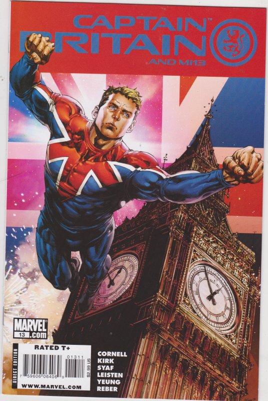 Captain Britain and MI13 #13 by Marvel Comics copyright 2009. I have graded the comic book, using the Overstreet Grading Guide, at FINE/VERY FINE with the following defects: Light stress marks along the spine. The corners are rounded. There is yellowing of the pages.Follow me on twitter @denofwonder for updates.