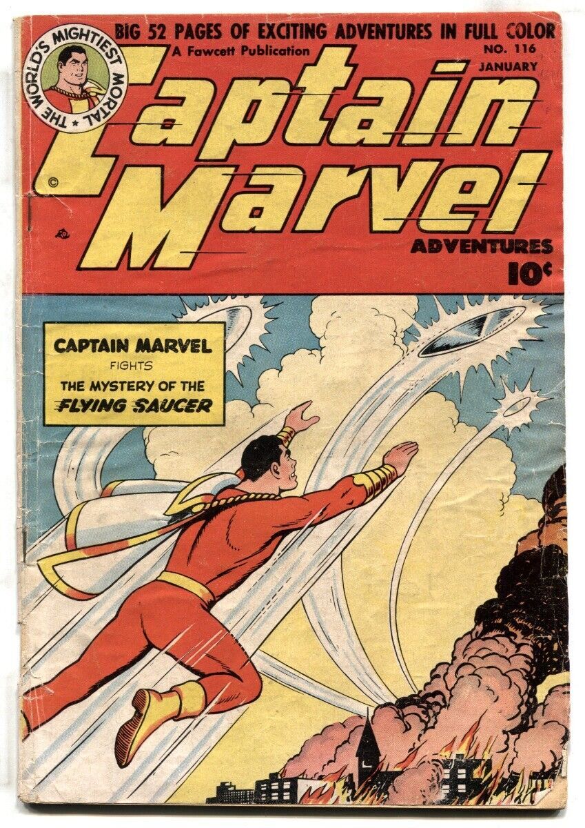Captain marvel adventures #116 1951, sivana, fawcett golden age, g/vg flying saucer cover and story. Sivana appears. Robot and sci-fi story. Back cover wrinkled with 2 small pieces missing. 1951 grade: g/vg sku: do-07-125