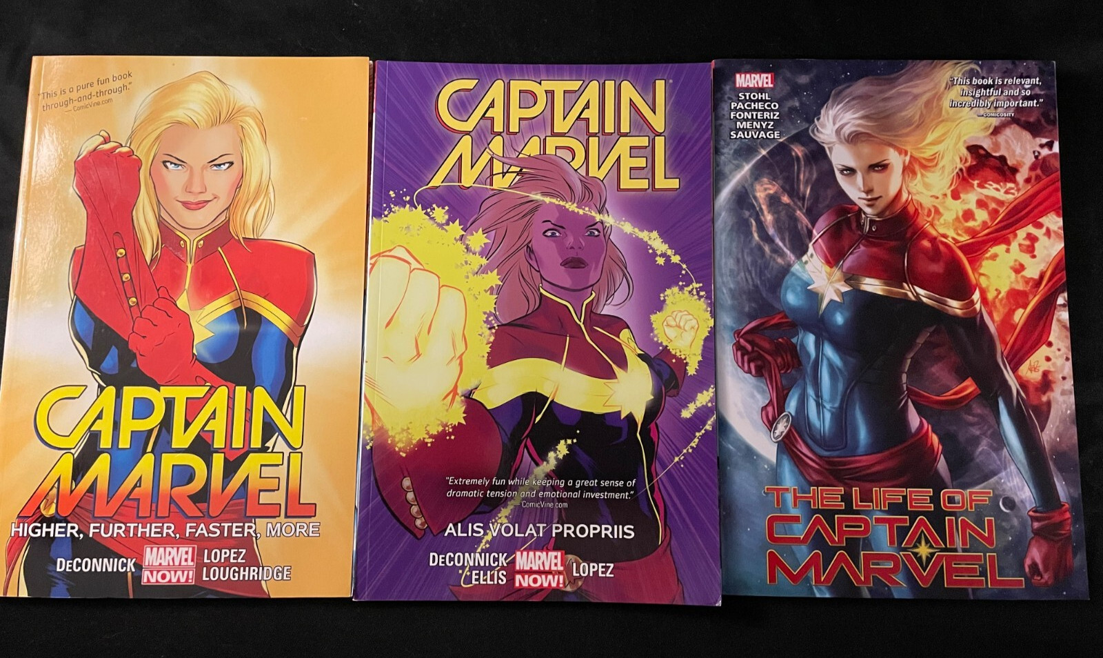 Captain Marvel Vol. 1: Higher, Further, Faster, More VG conditionCaptain Marvel Vol. 3: Alis Volat Propriis VG- conditionThe Life of Captain Marvel G conditionNo shipping charge for additional items