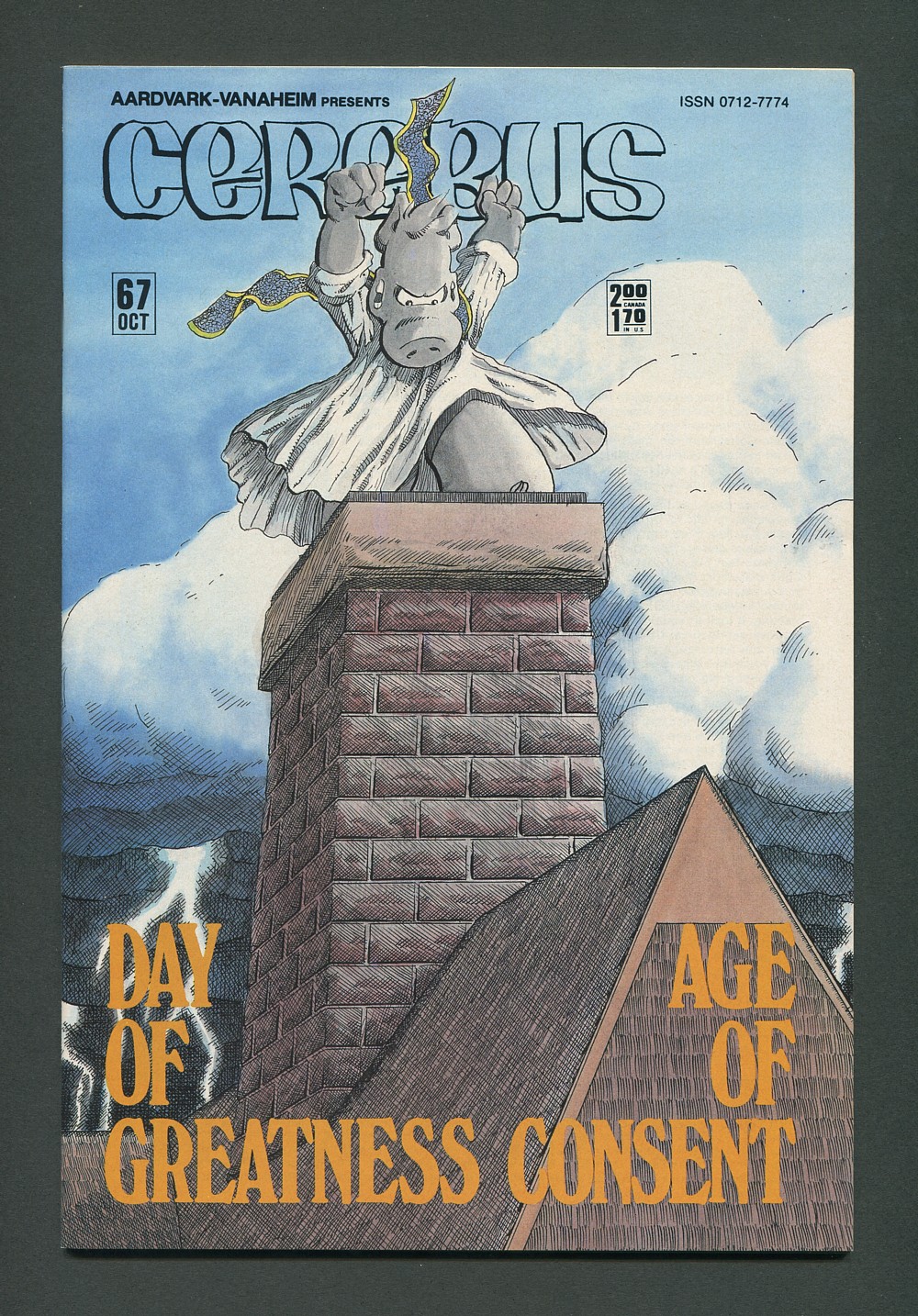 "Day of Greatness, Age of Consent." Back-up "Unique Story" featuring Spaced, "Wish Zone" (part 2) by Tom Stazer and John Williams. The letters page contains a photo of Dave Sim with Archie Goodwin and Will Eisner from a panel at Acmecon. There's also a Sim drawing of Cerebus as Mike Grell's Jon Sable, plus a photo and letter from C. Lingus as the "Bizarre Letter of the Month."