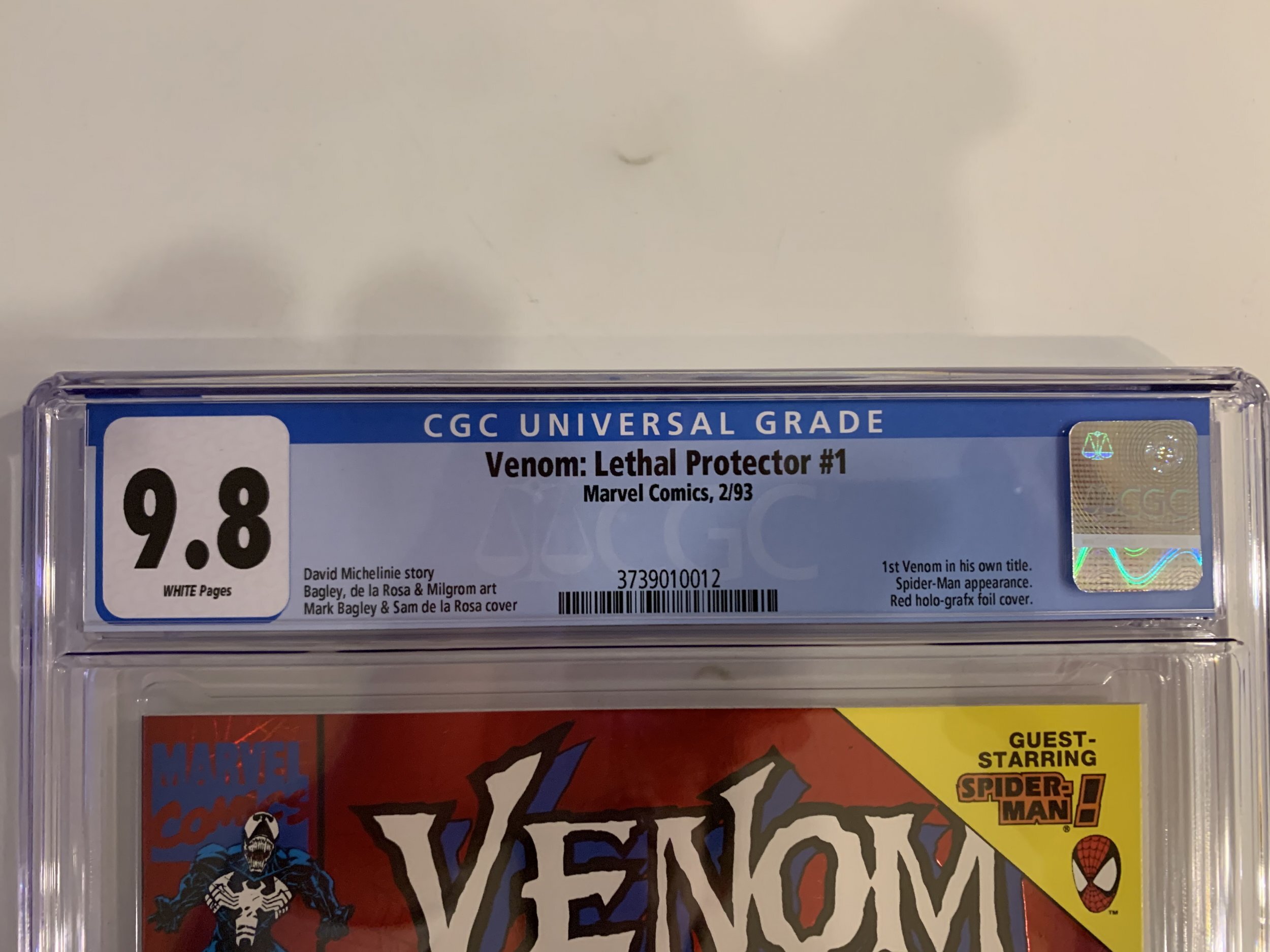 CGC 9.8 White Pages Venom Lethal Protector 1 - Foil Cover Bagley Art Cover 1993The pictures above represent the exact item you are going to receive. They are NOT stock pictures. There are no missing pages, rips or cutouts.I am not a professional grader, so please use the pictures above to determine the grade for yourself. I have tried to grade as accurately as possible.