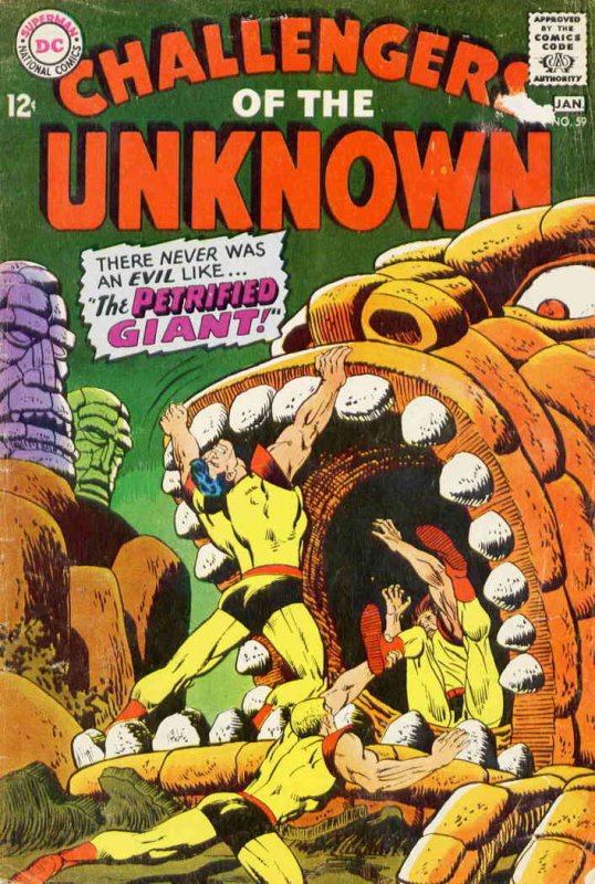 Item: Challengers of the Unknown #59 | Publisher: DC | Cover Date: January 1968 | Writer: Arnold Drake | Artist: Bob Brown | Cover Artist: Bob Brown | Appearances: Challengers of the Unknown | Storylines: Seekeenakee—the Petrified Giant! | With Economy shipping, each additional comic ships for just 50 cents more to customers in the USA. This listing contains a stock photo and information from ComicBase™ and © Human Computing. The stock photo is for reference only. If you would like to see a photo of the actual item, please message us prior to purchasing.Seller Information