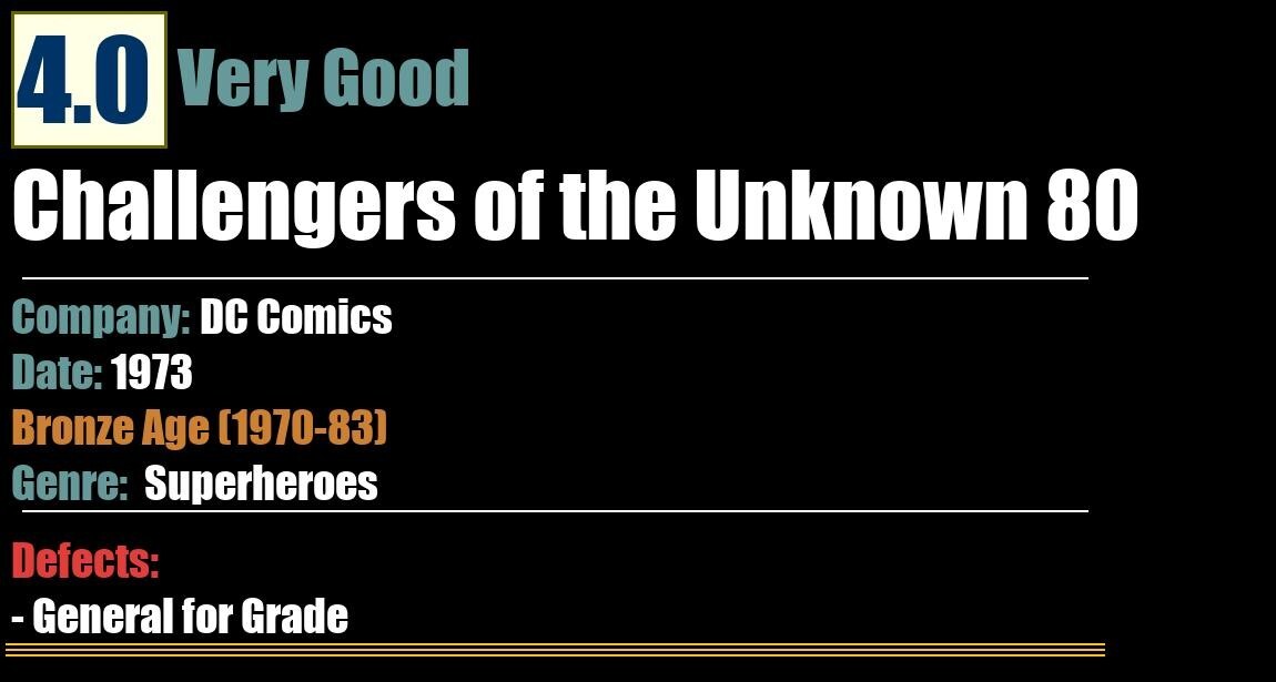 Grade: 4.0 Very Good Shipping may take up to 5 business daysChallengers of the Unknown 80DC Comics - 1973SuperheroesBronze Age (1970-83)4.0 Very GoodDefects:- General for Grade: