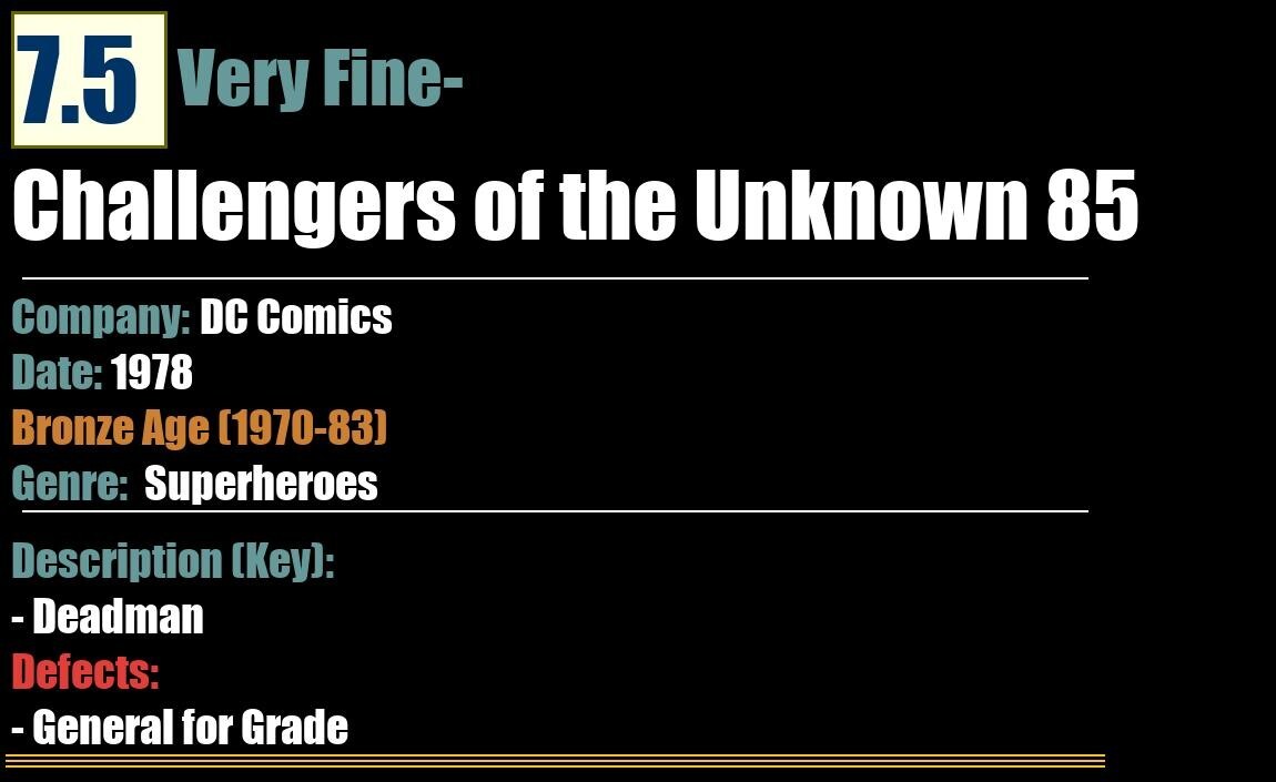 Grade: 7.5 Very Fine-Shipping may take up to 5 business daysChallengers of the Unknown 85DC Comics - 1978SuperheroesBronze Age (1970-83)7.5 Very Fine-Description/Key:- DeadmanDefects:- General for Grade: