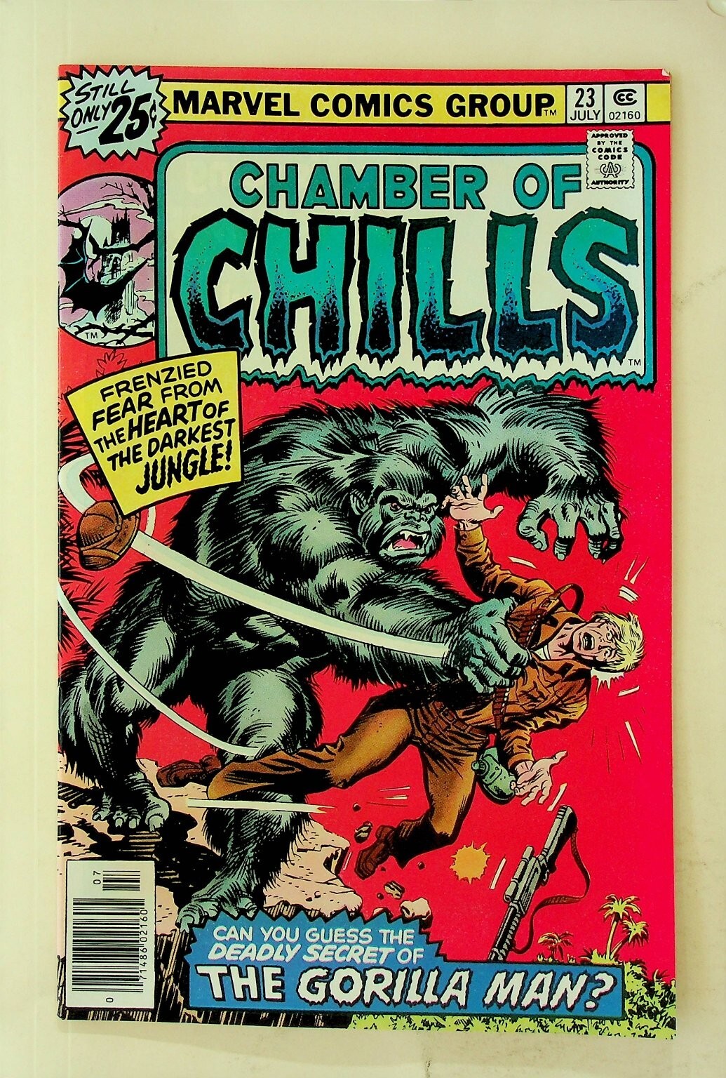 Grade: 9.0 Very Fine/Near MintThis is a single issue of Chamber of Chills #23, published by Marvel Comics Group. This vintage comic features a thrilling horror story with a dynamic Frank Brunner cover depicting a terrifying gorilla-like monster. The cover price of 25¢ clearly places this issue in the classic Bronze Age of comics, making it a desirable collectible for fans of vintage horror and monster comics. The back cover features a nostalgic advertisement for Monogram's "Hot Chevies" model kits.This listing includes one (1) comic book as pictured. It is a Newsstand Edition, identifiable by the UPC-style code on the bottom left of the cover. This issue is a great addition for collectors of Marvel's horror titles, Bronze Age comics, or those seeking iconic cover art. Discover the frenzied fear from the heart of the darkest jungle with this classic comic book.Verified Specifications:Publisher: Marvel Comics GroupSeries Title: Chamber of ChillsIssue Number: #23Item Type: Single IssueEra: Bronze AgeFormat: Newsstand EditionCover Type: Standard CoverKey Features: Frank Brunner CoverIncluded Components: 1x Comic BookCountry of Origin: USAOriginal Packaging: LooseCover Price: 25¢Publication Month: JulyUPC: 71486 02160