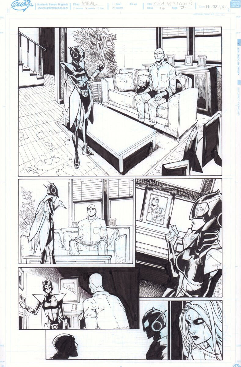 Champions #16 p.7 - Wasp & Viv Vision - 2017 art by Humberto Ramos Size: 11" x 17"This item was uploaded by Bobby.If you have any specific questions or requests, please ask us prior to ordering and we'll get back to you as soon as we can. If there are any problems with your order whatsoever, please message us before leaving feedback and we'll be happy to work with you to fix the situation!We ship worldwide, combine purchases, and charge exact shipping. The price may vary based on size, weight, and location. If you are automatically overcharged for shipping, message us and we'll be happy to revise the invoice or refund you the excess amount. If you have any questions regarding shipping, please message us.International Buyers - Please Note: Import duties, taxes, and charges are not included in the item price or shipping cost. These charges are the buyer's responsibility. Please check with your country's customs office to determine what these additional costs will be prior to bidding or buying. Payment can be made by PayPal and credit cards directly. 120,000+ items in total in my Hip store! Frequently Asked Questions: When are your operation hours?Our in office hours are Monday - Friday, 11 am - 8 pm. We are not open on weekends, so if you send us a request on Friday evening we won't get back to you until Monday afternoon. Please don't take it as us ignoring you! We will work on your request Monday and get back to you as soon as we can. Also, if you order from us on a Friday evening or Saturday morning we won't start processing your order until we open on Monday. That means on Monday it will be pulled and prepped for shipping, then picked up by the postman on Tuesday morning.When will you ship my item? The tracking hasn't moved.We realize you're eager to get your item, so if the tracking hasn't moved in a few days please don't be concerned. We give the postman a lot of packages daily, sometimes as many as 100, so he does not scan each item for us upon pickup as he says it would be too time consuming for him to do so. If you get a tracking number from us, that almost always means your item was picked up by the postman the next business day. The USPS is also imperfect. There are times when the tracking won't even show movement until it's in your area's regional distribution center. This is normal in our experience. Is this original artwork? Yes! I am a professional comic book art dealer with 20+ years experience. The image pictured is one of a kind original artwork unless otherwise described. Can you issue a COA? We can, upon request. Please make sure you leave us a note while checking out and shoot us a message immediately after requesting one, just to be sure. What is your base shipping for art? $10 for Domestic, International varies depending on location. Please use Hip's shipping calculator for specifics. How do you ship comics?We ship in rigid cardboard mailers to protect your comic book from the worst the mail system has to offer. Price varies based on the number of books you purchase, but we try to keep costs as low as we can and charge exact shipping. If it looks unusually high to you please send us a message and we'll be happy to double check for you. What is your base shipping for CGC comics? Domestic for CGCs are $10 for the first and $5 for each additional one you add. Do you combine shipping? Yes, of like items. Such as: several comics can fit in one cardboard mailer, as can more than one record. Multiple art pages can easily be combined because they are light and thin. Where combined shipping differs is with size and weight. For instance, two statues require a much bigger box. Same goes for CGCs, as the package gets bigger and heavier as you go. Do you ship well? I've had some bad experiences... You needn't worry; we are professionals who value your business and want your item to arrive safely as much as you do. I have been collecting for over 30 years. I send out items the way I would like to receive them. The tracking says my item is "OUT FOR DELIVERY" in New Jersey. Why is that?If the tracking indicates that the item is "OUT FOR DELIVERY" in NJ don't worry, it's just what the tracking says when it's carried over from the postman to the sorting center. This is normal for our Post Office and will not impact you receiving your item in a timely matter.Have these CGCs had any previous owners? No. I have personally sent in almost all of these to CGC and had them returned to me, offering them fresh to the market for the 1st time. I changed my mind after successfully winning the auction or fixed price listing, will you cancel the transaction? Please only bid or hit BUY IT NOW if you are willing to follow through and pay for the item, we will not cancel the transaction. As a seller, Hip penalizes us every time we cancel an order, so it is detrimental to our business to do so. Therefore if you will not pay, then you'll have to let Hip cycle this to an "unpaid item" and accept whatever action Hip deems necessary. 120,000+ items in total in my Hip store! AS SEEN ON TV : I have been buying and selling artwork and comics for about 20 years. If you are new to buying art or comics feel free to ask any questions that you may have. 120,000+ items in total in my Hip store! Small, Regular, and Large Portfolios available; see my Hip store!