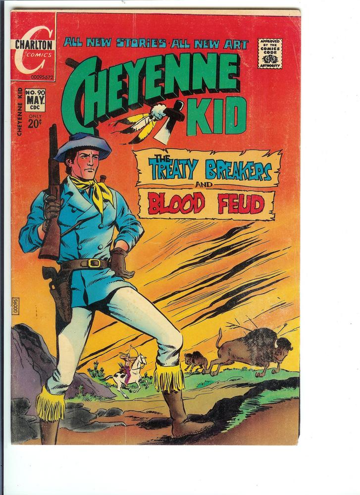 Cheyenne Kid #90, Vol. 4, May, 1972 Condition Very Good, (Est. Overstreet Price Listing selling this one for only $2.95).Cover by Sanho Kim & Sal Gentile. Featuring Cheyenne Kid in "The Treaty Breakers" and "Blood Feud"! Plus: Apache Red stars in the back-up story "A Short War"! And: Tenderfoot Sheriff in the 1-page text story "Wilson's Wagon Wheels"! 32 pages, full color. Cover price $0.20.
