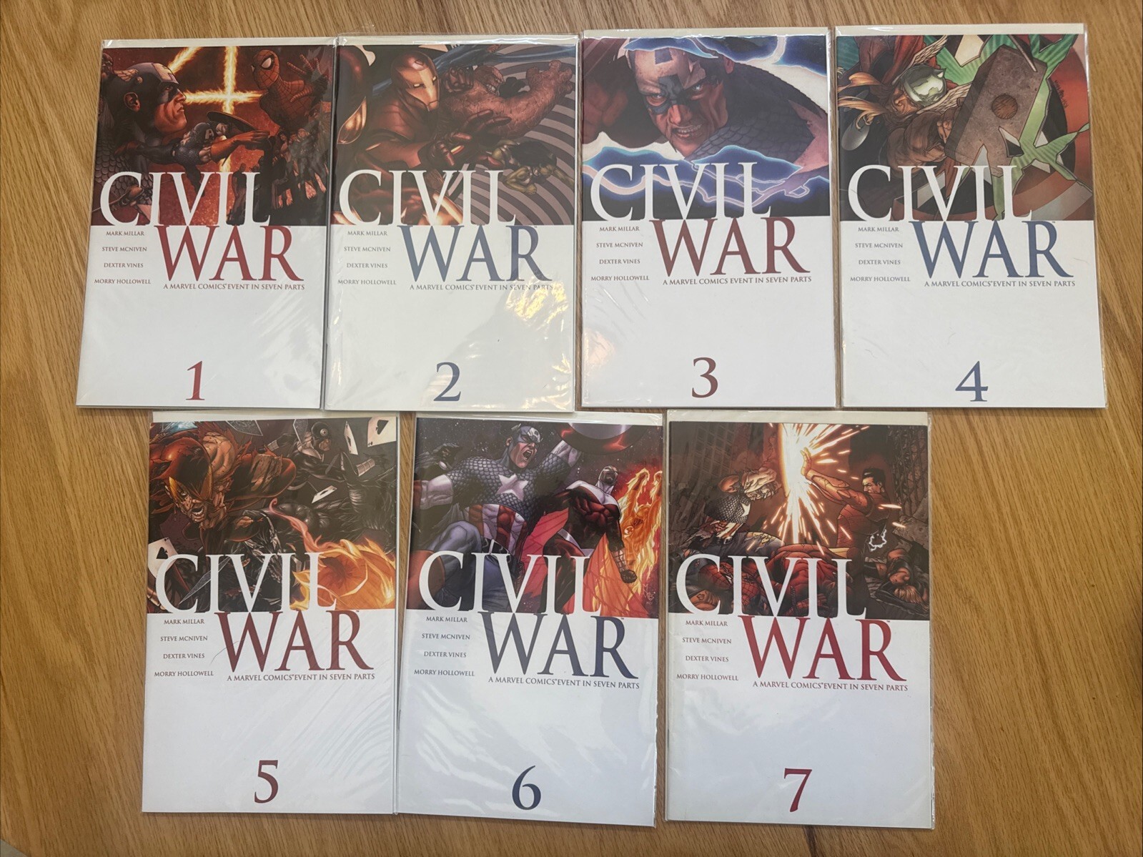 The product is a complete set of Marvel Comics' Civil War series, featuring issues #1-7 from 2006. The series, written by Mark Millar and illustrated by Steve McNiven, includes popular characters such as Captain Ame ... Read More