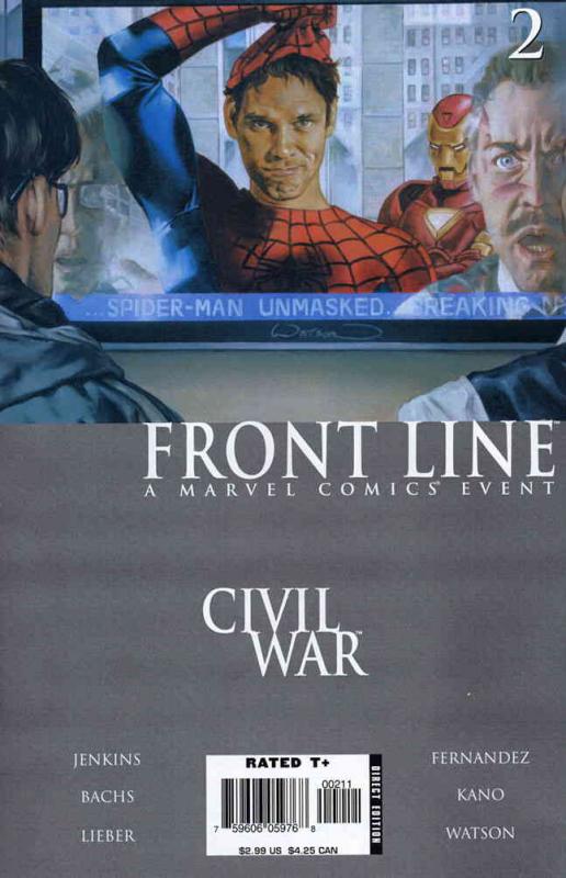 Item: Civil War: Front Line #2 | Publisher: Marvel | Cover Date: August 2006 | Writer: Paul Jenkins | Artist: Ramon F. Bachs, Steve Lieber, Leandro Fernandez, Kano | Cover Artist: John Watson | Appearances: Spider-Man, Firestar, Prodigy, Iron Man, Speedball | Storylines: Embedded, Part 2; The Accused, Part 2; The Program | With Economy shipping, each additional comic ships for just 50 cents more to customers in the USA. This listing contains a stock photo and information from ComicBase™ and © Human Computing. The stock photo is for reference only. If you would like to see a photo of the actual item, please message us prior to purchasing.Seller Information