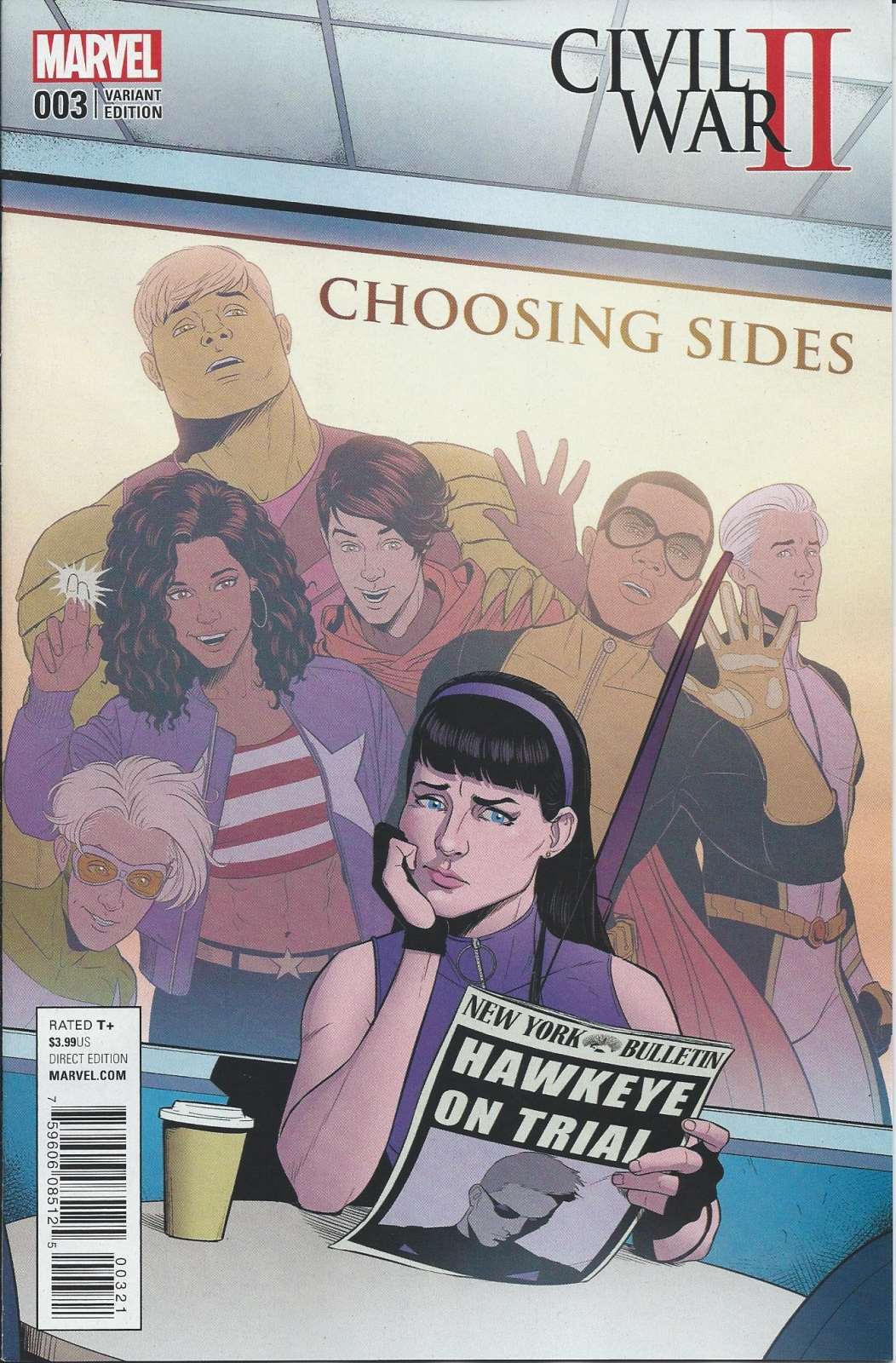 Item: Civil War II: Choosing Sides #3A | Publisher: Marvel | Cover Date: September 2016 | Writer: Ming Doyle, Derek Landy | Artist: Declan Shalvey | Cover Artist: Jamie McKelvie | Appearances: Avengers, Hulkling, Wiccan, Fact Channel News, J. Jonah Jameson, Lola, McSweeny, Silk, Nick Fury Jr., Hawkeye (Kate Bishop), Lucky, Ms. America (America Chavez), Prodify | Storylines: Kate Bishop; J. Jonah Jameson; Nick Fury: Post Prologue, Part 3 | Notes: Variant Cover by McKelvie | With Economy shipping, each additional comic ships for just 50 cents more to customers in the USA. This listing contains a stock photo and information from ComicBase™ and © Human Computing. The stock photo is for reference only. If you would like to see a photo of the actual item, please message us prior to purchasing.Seller Information