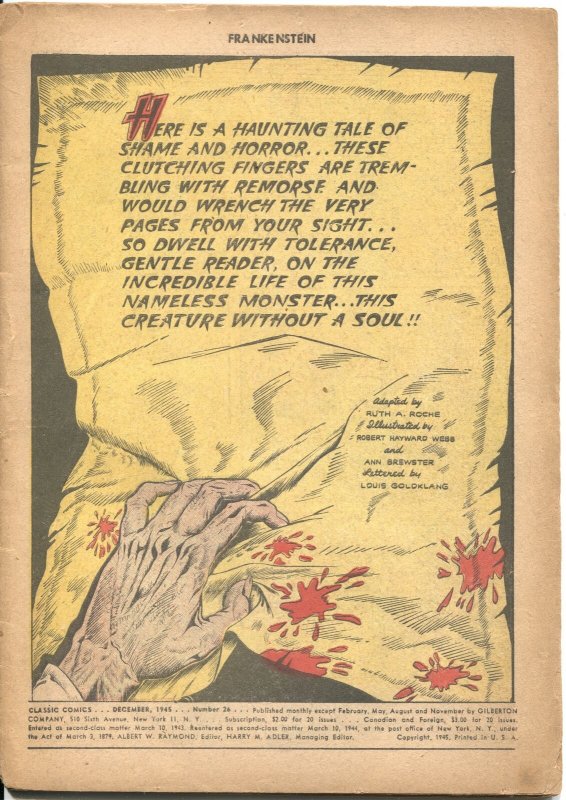 CLASSICS COMICS #26--FRANKENSTEIN-1945-MARY SCHELLEY-ANN BREWESTER ART--1st ED