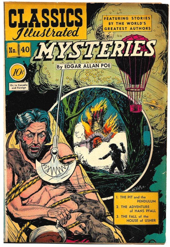 CLASSICS ILLUSTRATED was an American comic book series featuring adaptations of literary classics such as Moby Dick, Hamlet, and Twenty Thousand Leagues Under the Sea. Created by Albert Kanter, the series began publication by the Gilberton Company in 1941, and finished its first run in 1969, producing 169 issues.Here in issue #40 from August 1947 is the CLASSICS ILLUSTRATED version of three of EDGAR ALLAN POE's better-known mysteries, under the umbrella title "MYSTERIES by EDGAR ALLAN POE".