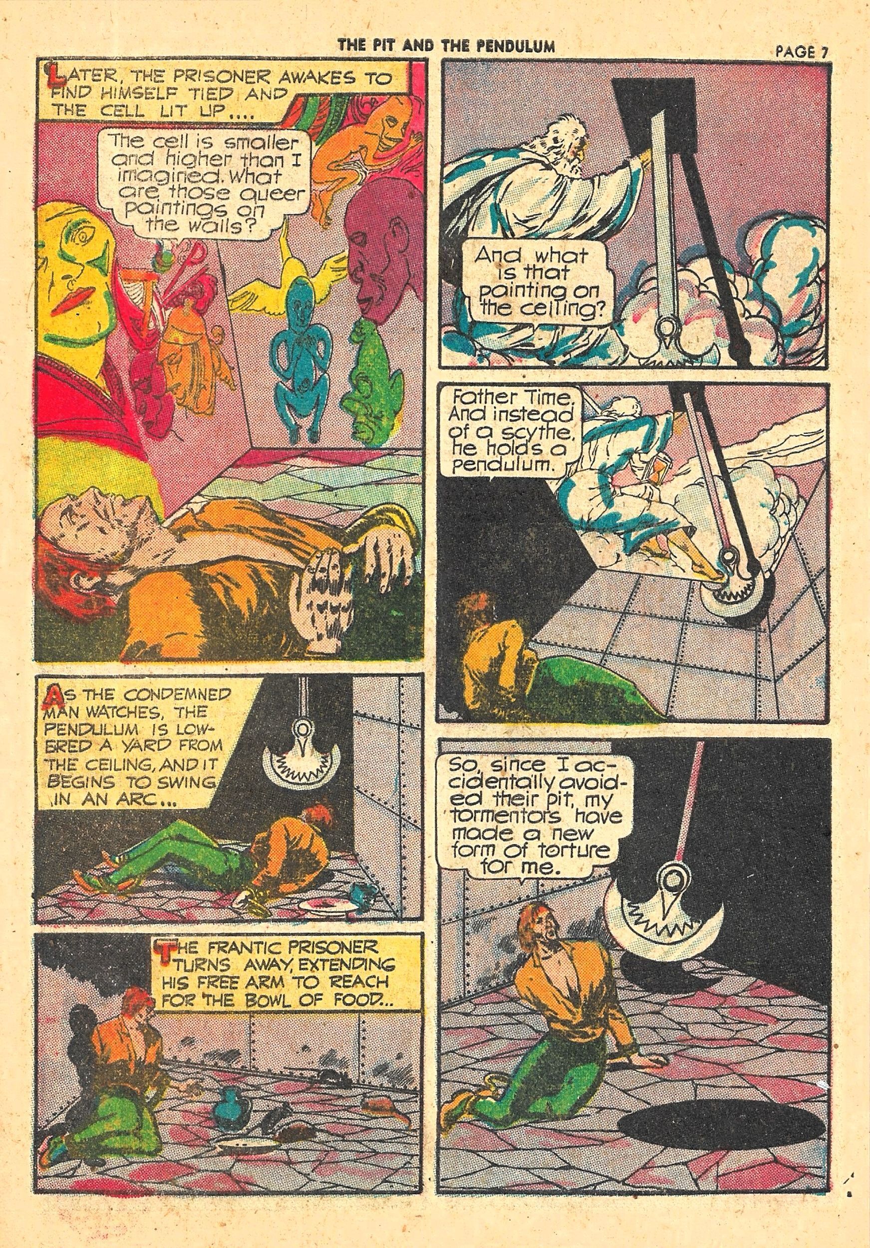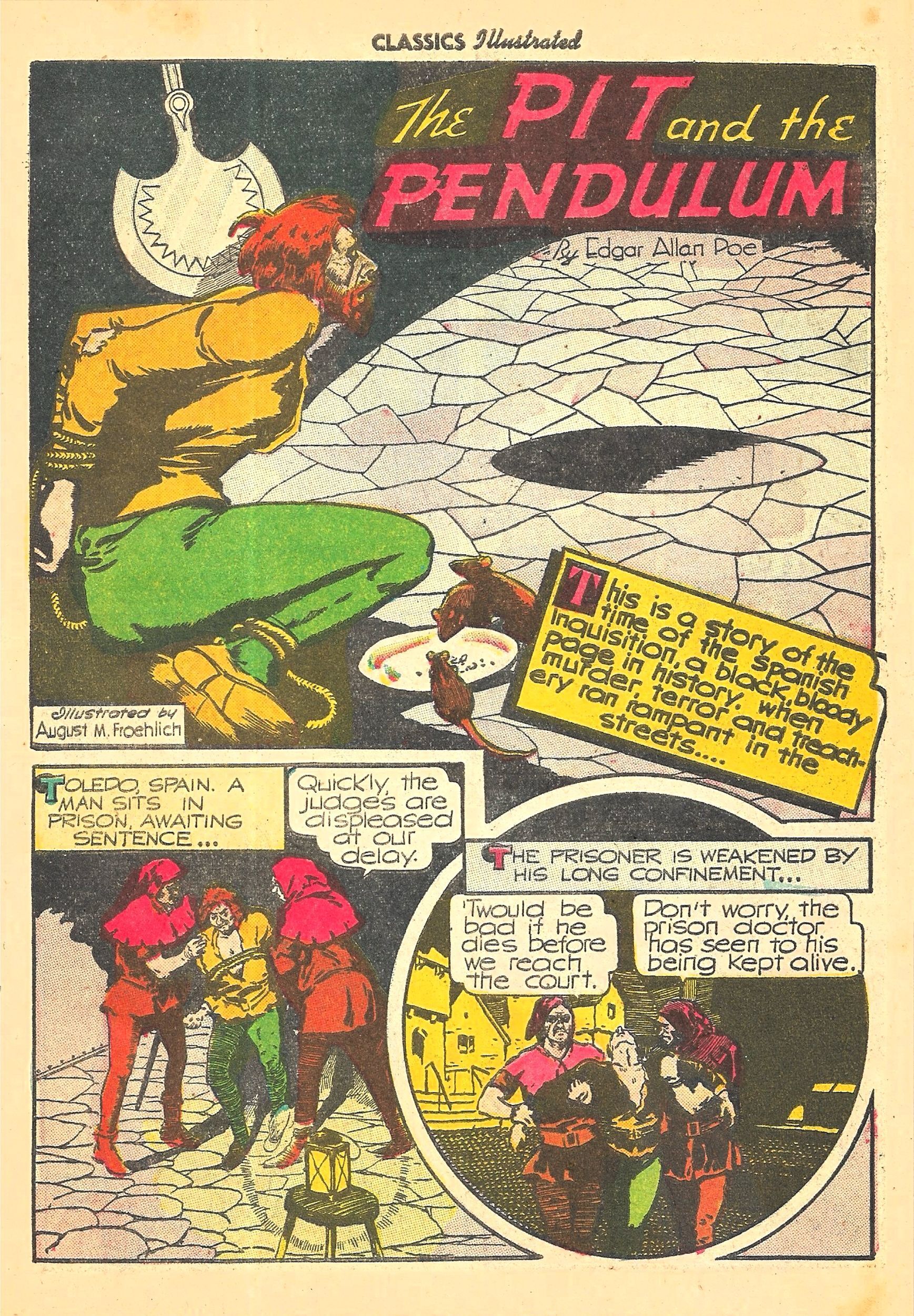 The first of the 3 stories in this big 60-page comic is 'THE PIT AND THE PENDULUM' illustrated by August Froehlich with period accuracy. A victim of the Spanish Inquisition is tortured in a dark room with a razor-sharp pendulum, a water-filled pit, rats, and other devices until liberated when Toledo, Spain falls to the French.