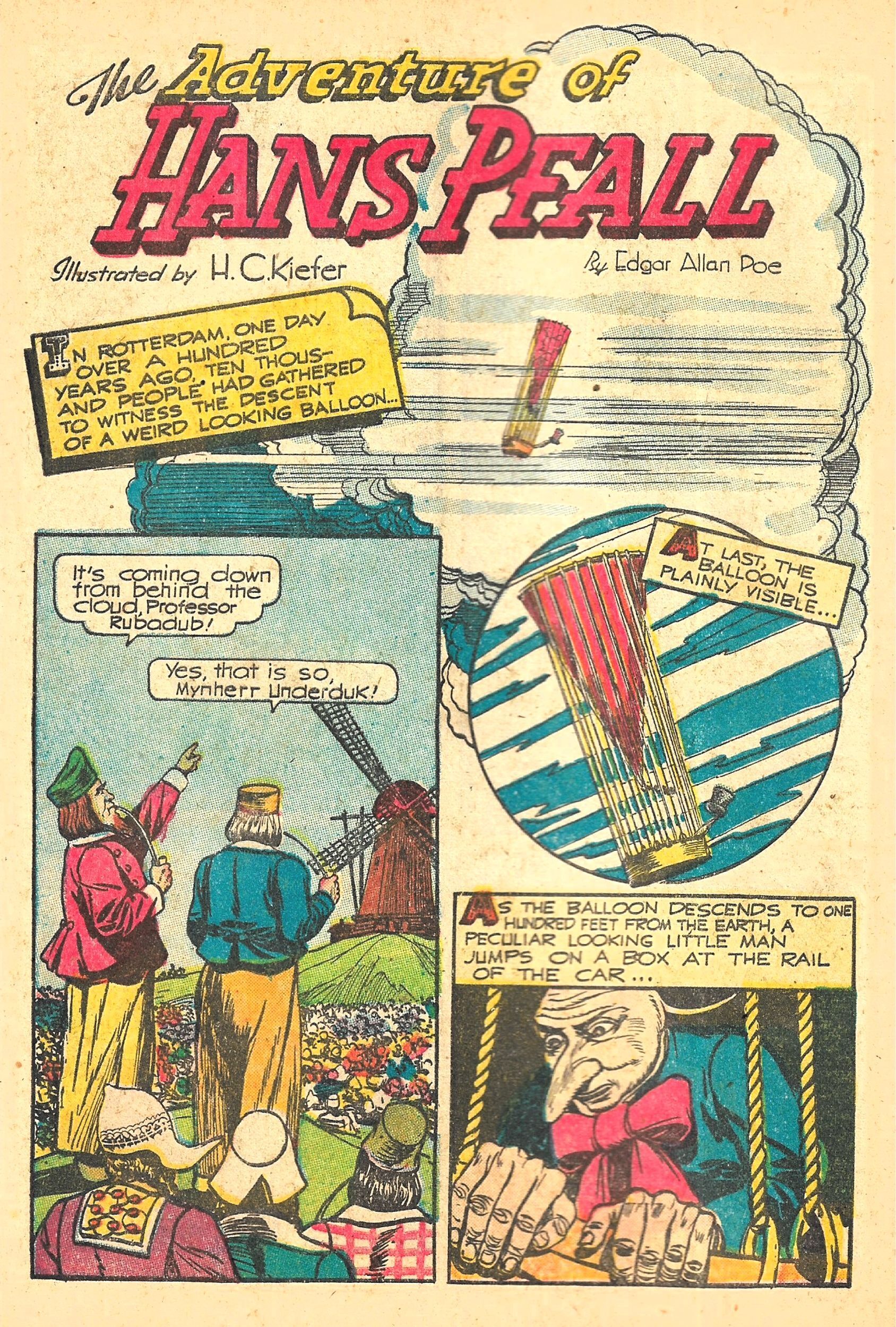 Next up is 'THE ADVENTURE OF HANS PFALL', illustrated by Henry Kiefer (who also illustrated the cover of this issue) and over 22 pages, tells the story of how Pfall kills his three creditors with an explosion then travels to the moon in a balloon of his own design, to become King of the Moon People!