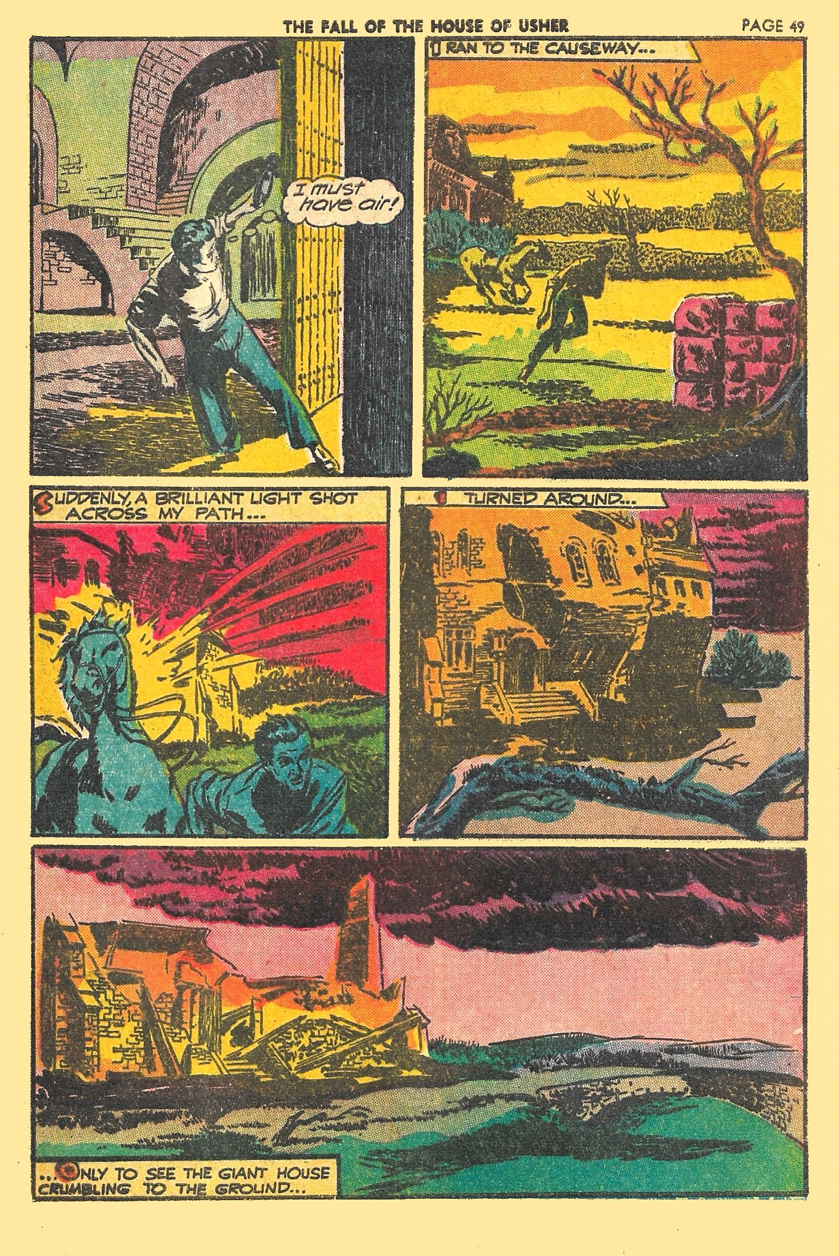 The third adaptation is 'THE FALL OF THE HOUSE OF USHER', illustrated by Harley Griffiths, and tells of how Roderick Usher buries his catatonic twin sister Madeline then dies from fear and horror when she rises from her grave, just before the crumbling Usher mansion collapses upon them!