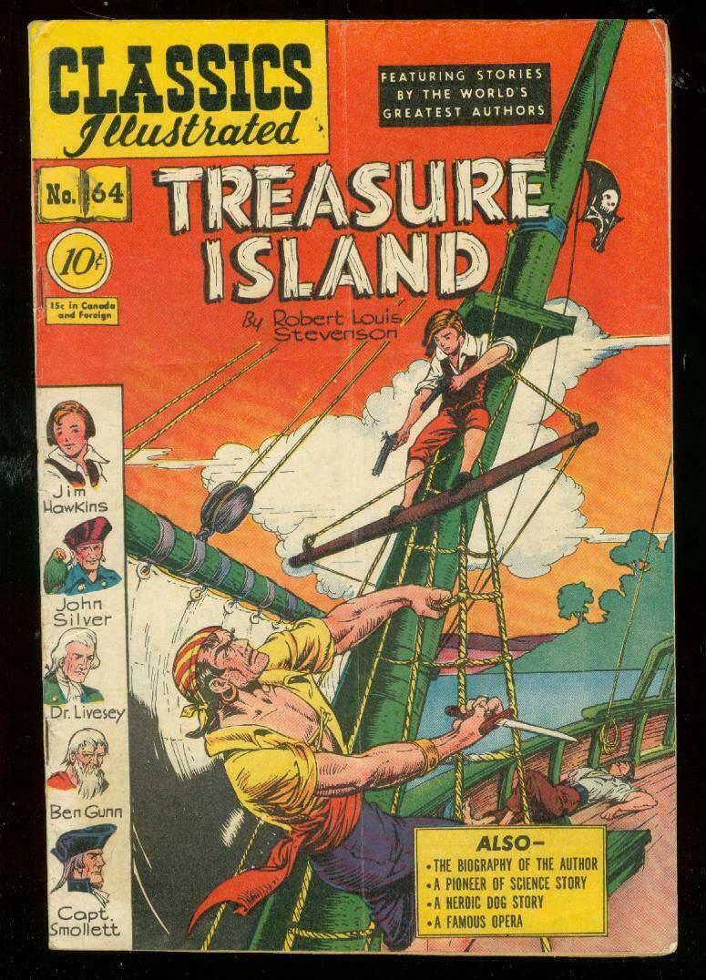 Classics Illustrated Issue: 64 HRN 62 / Year: 1949 Condition: FN-Treasure Island by Robert Louis Stevenson, 64 HRN 62, 1st Edition. Glossy cover has vertical crease. Publisher: GilbertonSku: DO-06-075 Over 100,000 mail orders processed! Buy with confidence.