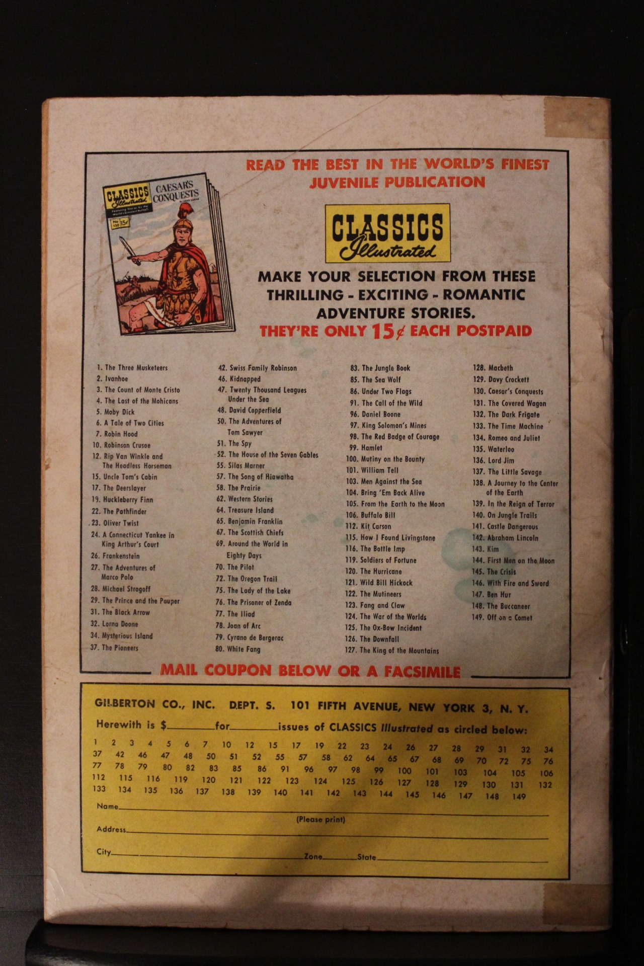 Classics Illustrated Special Issue #150 (1959)This book has deep rich color and nice eye-appeal on this all-time-classic orginal 1st print classic comic! With cream to slight heavy-cream tint interiors. This book comes with a certificate of authenticity from our one-owner, high-grade "Wythville" collection! There are dark tape-seals at the ends of the spine. We have adjsuted the grade accordingly.