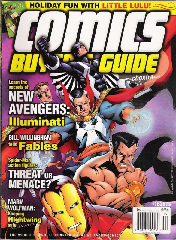 Item: Comics Buyer's Guide #1626 | Publisher: F&W | Cover Date: March 2007 | Writer: Peter David, Craig Shutt, Michelle Nolan | Cover Artist: Mark McKenna | Storylines: Who’s Who in the Four-Color Funnies: Saluting G.I. Jane (text); G.I. Jane #1-11 (text); Amazing Spider-Man (Vol. 2) #25-36 & Annual 2001 (text); John Carter, Warlord of Mars #8-19 & Annual #2 (text); Marvel and DC Present #1 (text) | Notes: New Avengers: Illuminati cover; 192 pages | With Economy shipping, each additional comic ships for just 50 cents more to customers in the USA. This listing contains a stock photo and information from ComicBase™ and © Human Computing. The stock photo is for reference only. If you would like to see a photo of the actual item, please message us prior to purchasing.