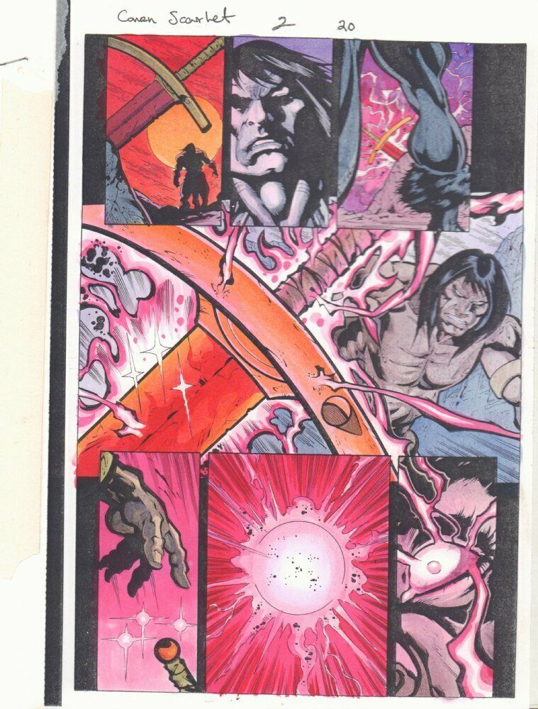 Conan: Scarlet Sword #2 p.20 Color Guide Art - Conan gets Possessed by the Magic Red Sword - 1999Stefano Raffaele pencillerRalph Cabrera inkerJohn Kalisz painter"This is a B&W STAT photo copy that the colorist, John Kalisz, painted over to create the published page. This is color art only, the original pencils and inks aren't on here." 9.5" x 11" with some moderate wear along the edges.This item was uploaded by Bobby.If you have any specific questions or requests, please ask us prior to ordering and we'll get back to you as soon as we can. If there are any problems with your order whatsoever, please message us before leaving feedback and we'll be happy to work with you to fix the situation!We ship worldwide, combine purchases, and charge exact shipping. The price may vary based on size, weight, and location. If you are automatically overcharged for shipping, message us and we'll be happy to revise the invoice or refund you the excess amount. If you have any questions regarding shipping, please message us.International Buyers - Please Note: Import duties, taxes, and charges are not included in the item price or shipping cost. These charges are the buyer's responsibility. Please check with your country's customs office to determine what these additional costs will be prior to bidding or buying. Payment can be made by PayPal and credit cards directly. 120,000+ items in total in my Hip store! Frequently Asked Questions: When are your operation hours?Our in office hours are Monday - Friday, 11 am - 8 pm. We are not open on weekends, so if you send us a request on Friday evening we won't get back to you until Monday afternoon. Please don't take it as us ignoring you! We will work on your request Monday and get back to you as soon as we can. Also, if you order from us on a Friday evening or Saturday morning we won't start processing your order until we open on Monday. That means on Monday it will be pulled and prepped for shipping, then picked up by the postman on Tuesday morning.When will you ship my item? The tracking hasn't moved.We realize you're eager to get your item, so if the tracking hasn't moved in a few days please don't be concerned. We give the postman a lot of packages daily, sometimes as many as 100, so he does not scan each item for us upon pickup as he says it would be too time consuming for him to do so. If you get a tracking number from us, that almost always means your item was picked up by the postman the next business day. The USPS is also imperfect. There are times when the tracking won't even show movement until it's in your area's regional distribution center. This is normal in our experience. Is this original artwork? Yes! I am a professional comic book art dealer with 20+ years experience. The image pictured is one of a kind original artwork unless otherwise described. Can you issue a COA? We can, upon request. Please make sure you leave us a note while checking out and shoot us a message immediately after requesting one, just to be sure. What is your base shipping for art? $10 for Domestic, International varies depending on location. Please use Hip's shipping calculator for specifics. How do you ship comics?We ship in rigid cardboard mailers to protect your comic book from the worst the mail system has to offer. Price varies based on the number of books you purchase, but we try to keep costs as low as we can and charge exact shipping. If it looks unusually high to you please send us a message and we'll be happy to double check for you. What is your base shipping for CGC comics? Domestic for CGCs are $10 for the first and $5 for each additional one you add. Do you combine shipping? Yes, of like items. Such as: several comics can fit in one cardboard mailer, as can more than one record. Multiple art pages can easily be combined because they are light and thin. Where combined shipping differs is with size and weight. For instance, two statues require a much bigger box. Same goes for CGCs, as the package gets bigger and heavier as you go. Do you ship well? I've had some bad experiences... You needn't worry; we are professionals who value your business and want your item to arrive safely as much as you do. I have been collecting for over 30 years. I send out items the way I would like to receive them. The tracking says my item is "OUT FOR DELIVERY" in New Jersey. Why is that?If the tracking indicates that the item is "OUT FOR DELIVERY" in NJ don't worry, it's just what the tracking says when it's carried over from the postman to the sorting center. This is normal for our Post Office and will not impact you receiving your item in a timely matter.Have these CGCs had any previous owners? No. I have personally sent in almost all of these to CGC and had them returned to me, offering them fresh to the market for the 1st time. I changed my mind after successfully winning the auction or fixed price listing, will you cancel the transaction? Please only bid or hit BUY IT NOW if you are willing to follow through and pay for the item, we will not cancel the transaction. As a seller, Hip penalizes us every time we cancel an order, so it is detrimental to our business to do so. Therefore if you will not pay, then you'll have to let Hip cycle this to an "unpaid item" and accept whatever action Hip deems necessary. 120,000+ items in total in my Hip store! MEET OUR STAFF: Pictured left to right, my employees: Bobby, Justin, Mario V., Connelly, Mario B., Alejandro, Sumie, and Anthony.AS SEEN ON TV : I have been buying and selling artwork and comics for about 20 years. If you are new to buying art or comics feel free to ask any questions that you may have. 120,000+ items in total in my Hip store! Small, Regular, and Large Portfolios available; see my Hip store!