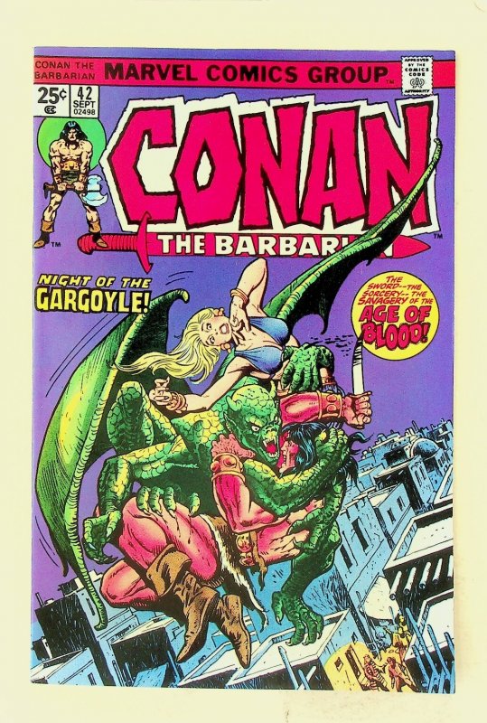 Grade: 8.5 Very Fine+This is a single issue of Conan The Barbarian #42 published by Marvel Comics Group, released in September 1974. This classic Bronze Age comic features the story "Night of the Gargoyle!" and showcases the iconic barbarian in action against monstrous foes. The cover price is 25¢, consistent with comics from this era. This is a Newsstand Edition, identifiable by the lack of a UPC barcode, typical for comics of this period.This listing includes one (1) comic book as pictured. It is a vintage Marvel Comics collectible, perfect for fans of Conan, sword and sorcery, and Bronze Age comic books. Explore the savage world of Conan with this key issue, a great addition for any comic book collector.Verified Specifications:Publisher: Marvel Comics GroupSeries Title: Conan The BarbarianIssue Number: #27Item Type: Single IssueEra: Bronze AgeFormat: Newsstand EditionKey Features: Vintage, Comic BookIncluded Components: 1x Comic BookCountry of Origin: USA