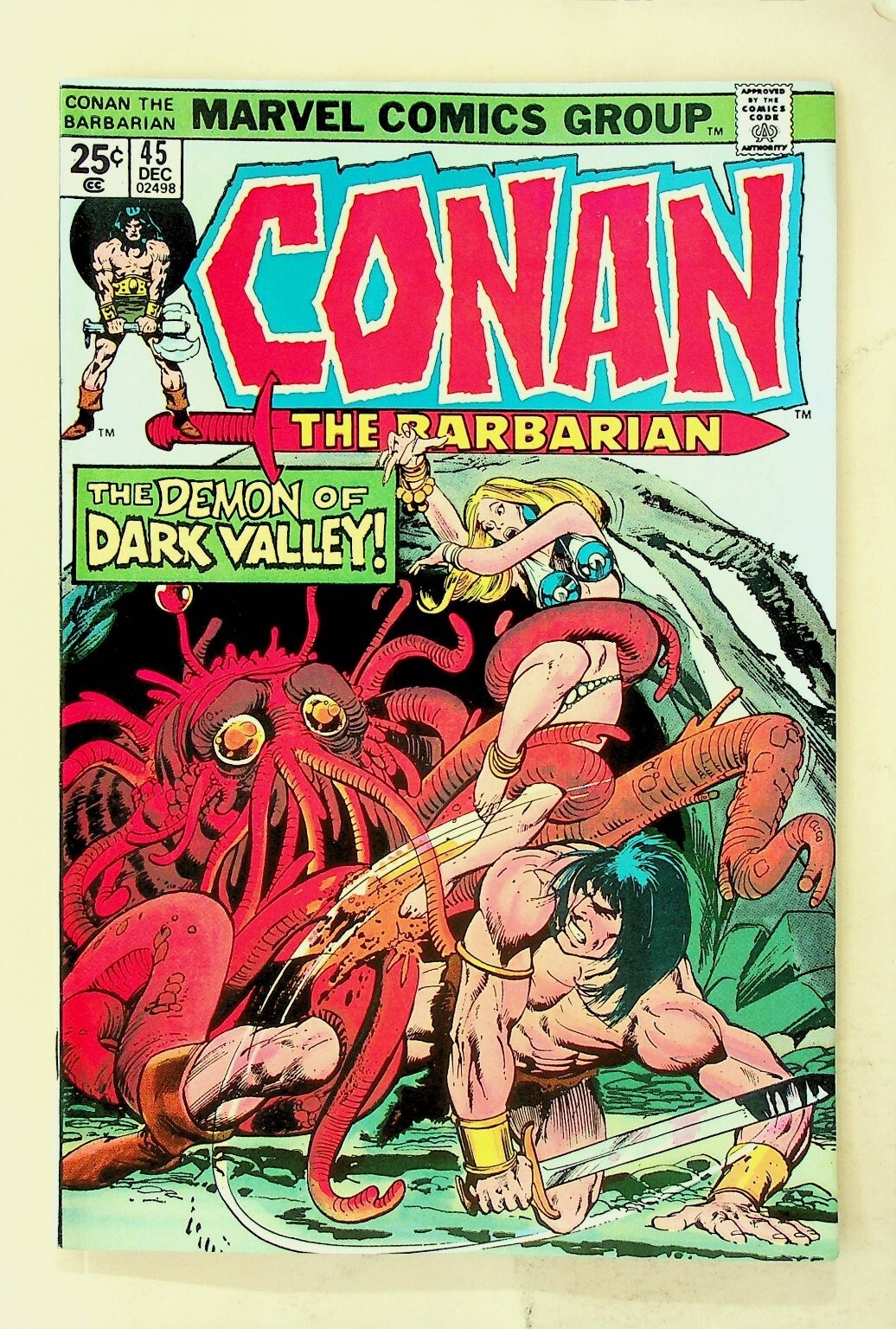 Grade: 7.0 Fine/Very FineThis is a single issue of Conan The Barbarian #45 published by Marvel Comics Group. This vintage comic book features the story "THE DEMON OF DARK VALLEY!" and showcases classic Bronze Age artwork. The comic is a standard US comic book in full color, identifying as a Newsstand Edition due to the back cover advertisement. This collectible issue is a great addition for fans of Conan, Marvel Comics, and Bronze Age comic books.This listing includes one (1) comic book as shown in the images. It is a key piece for any collector interested in the adventures of Conan the Barbarian, a prominent character in the Marvel Universe.Verified Specifications:Publisher: Marvel Comics GroupSeries Title: Conan The BarbarianIssue Number: #45Item Type: Single IssueEra: Bronze AgeFormat: Newsstand EditionKey Features: None explicitly statedIncluded Components: 1x Comic BookCountry of Origin: USACover Price: 25¢Publication Date: December 1974