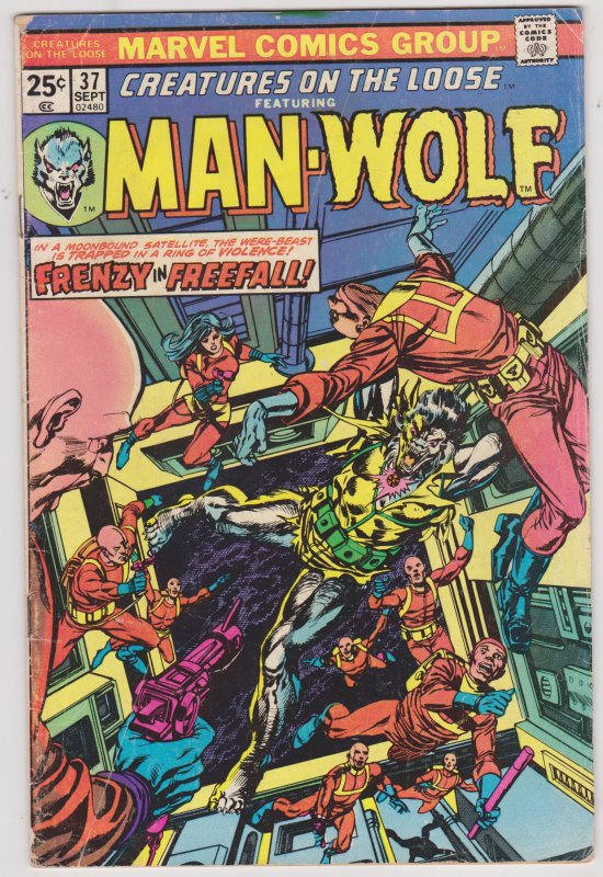 Creatures on the Loose #37 (1975) by Marvel Comics. I have graded the comic book atVERY GOOD+ with the following defects: Light stress marks along the spine. Piece missing from the upper left corner. The corners are rounded. Small folds in the upper and lower right corners. There is yellowing of the pages.