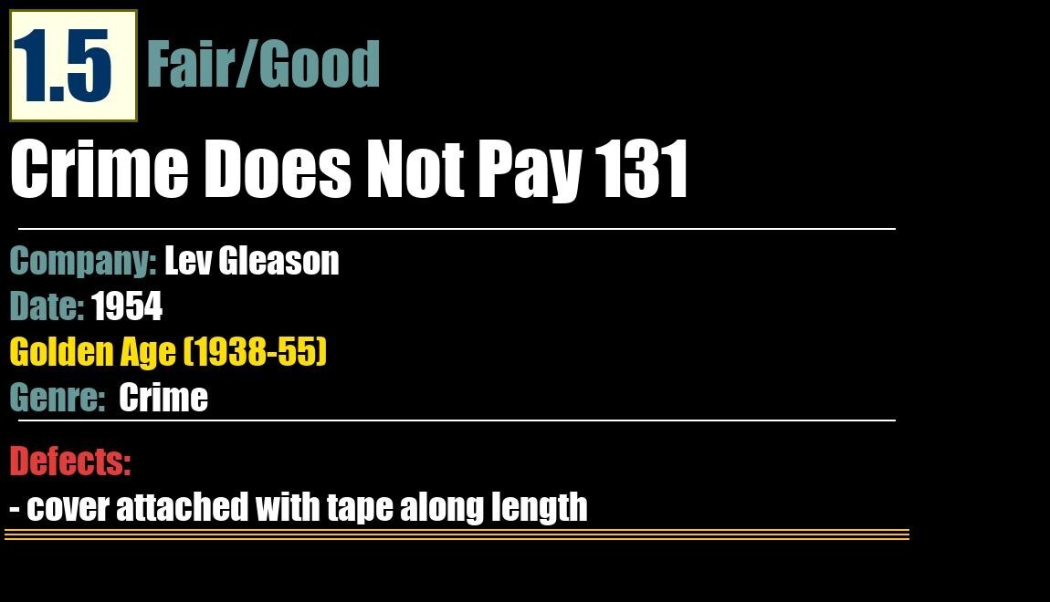 Grade: 1.5 Fair/GoodShipping may take up to 5 business daysCrime Does Not Pay 131Lev Gleason - 1954CrimeGolden Age (1938-55)1.5 Fair/GoodDefects:- cover attached with tape along length