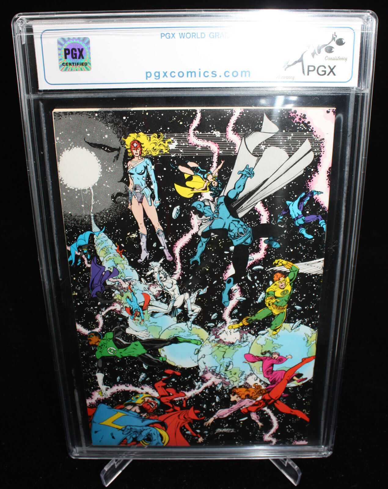 Grade: 9.8 Near Mint/MintCrisis on Infinite Earths #1 (PGX 9.8) George Perez Cover - 1985Size: 8" x 13"This item was uploaded by RV.If you have any specific questions or requests, please ask us prior to ordering and we'll get back to you as soon as we can. If there are any problems with your order whatsoever, please message us before leaving feedback and we'll be happy to work with you to fix the situation!We ship worldwide, combine purchases, and charge exact shipping. The price may vary based on size, weight, and location. If you are automatically overcharged for shipping, message us and we'll be happy to revise the invoice or refund you the excess amount. If you have any questions regarding shipping, please message us.International Buyers - Please Note: Import duties, taxes, and charges are not included in the item price or shipping cost. These charges are the buyer's responsibility. Please check with your country's customs office to determine what these additional costs will be prior to bidding or buying. Payment can be made by PayPal and credit cards directly.120,000+ items in total in my Hip store! Frequently Asked Questions: When are your operation hours? Our in office hours are Monday - Friday, 11 am - 8 pm. We are not open on weekends, so if you send us a request on Friday evening we won't get back to you until Monday afternoon. Please don't take it as us ignoring you! We will work on your request Monday and get back to you as soon as we can. Also, if you order from us on a Friday evening or Saturday morning we won't start processing your order until we open on Monday. That means on Monday it will be pulled and prepped for shipping, then picked up by the postman on Tuesday morning. When will you ship my item? The tracking hasn't moved. We realize you're eager to get your item, so if the tracking hasn't moved in a few days please don't be concerned. We give the postman a lot of packages daily, sometimes as many as 100, so he does not scan each item for us upon pickup as he says it would be too time consuming for him to do so. If you get a tracking number from us, that almost always means your item was picked up by the postman the next business day. The USPS is also imperfect. There are times when the tracking won't even show movement until it's in your area's regional distribution center. This is normal in our experience. Is the item pictured the exact one for sale?Yes! We don't use stock images and go through great lengths to photograph everything we list. The item pictured is exactly what you should receive UNLESS it is a fixed price listing with multiple items available.Have these CGCs had any previous owners? No. I have personally sent in almost all of these to CGC and had them returned to me, offering them fresh to the market for the 1st time. What is your base shipping for CGC comics? Domestic for CGCs are $10 for the first and $5 for each additional one you add. How do you ship comics?We ship in rigid cardboard mailers to protect your comic book from the worst the mail system has to offer. Price varies based on the number of books you purchase, but we try to keep costs as low as we can and charge exact shipping. If it looks unusually high to you please send us a message and we'll be happy to double check for you. Do you combine shipping? Yes, of like items. Such as: several comics can fit in one cardboard mailer, as can more than one record. Multiple art pages can easily be combined because they are light and thin. Where combined shipping differs is with size and weight. For instance, two statues require a much bigger box. Same goes for CGCs, as the package gets bigger and heavier as you go. Do you ship well? I've had some bad experiences... You needn't worry; we are professionals who value your business and want your item to arrive safely as much as you do. I have been collecting for over 30 years. I send out items the way I would like to receive them. The tracking says my item is "OUT FOR DELIVERY" in New Jersey. Why is that?If the tracking indicates that the item is "OUT FOR DELIVERY" in NJ don't worry, it's just what the tracking says when it's carried over from the postman to the sorting center. This is normal for our Post Office and will not impact you receiving your item in a timely matter.I changed my mind after successfully winning the auction or fixed price listing, will you cancel the transaction? Please only bid or hit BUY IT NOW if you are willing to follow through and pay for the item, we will not cancel the transaction. As a seller, Hip penalizes us every time we cancel an order, so it is detrimental to our business to do so. Therefore if you will not pay, then you'll have to let Hip cycle this to an "unpaid item" and accept whatever action Hip deems necessary. 120,000+ items in total in my Hip store! AS SEEN ON TV I have been buying and selling artwork and comics for about 20 years. The artwork pictured are all one of kind originals unless otherwise described. If you are new to buying art feel free to ask any questions that you may have. 120,000+ items in total in my Hip store! Small, Regular, and Large Portfolios available; see my Hip store!