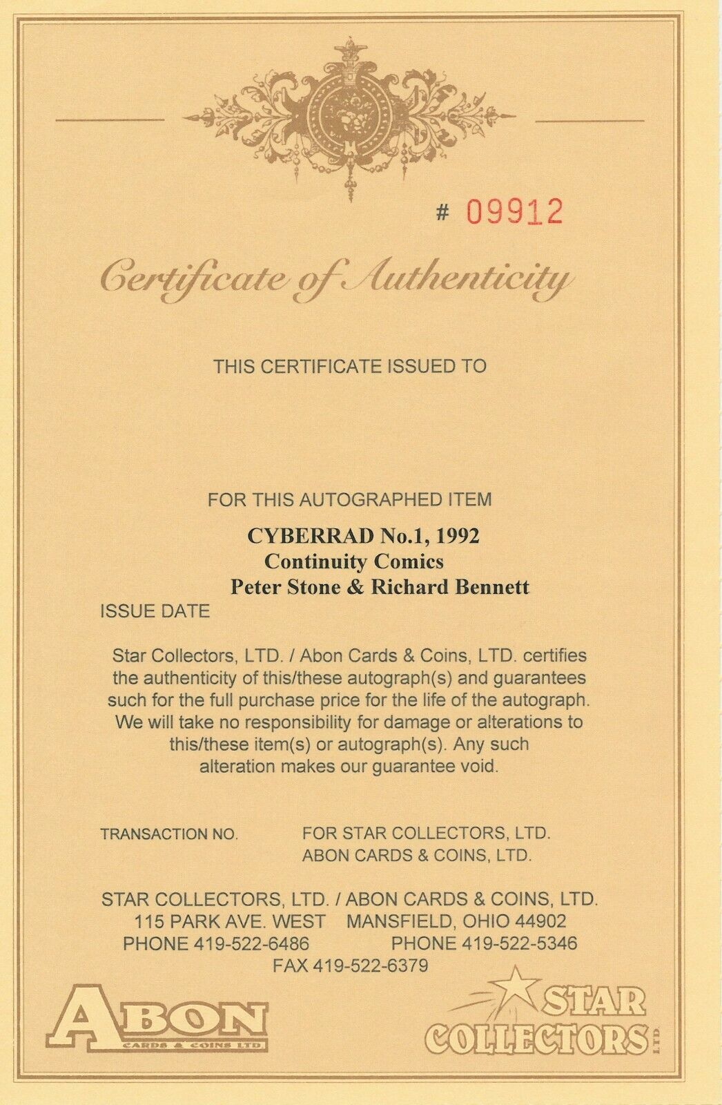 Item Information: CYBERRAD #1 DOUBLE SIGNED BY PETER STONE & RICHARD BENNETT CONTINUITY COMICS 1992 EB204DESCRIPTION FROM DIAMOND OR LUNAR INCLUDING TITLE, WRITER, ARTIST, AND COVER ARTIST. INCLUDING BLUB*Please note we put a generic grade of 9.2 VF/NM on all of our listings of comics but most are in better condition with very few being worse.*Certificate of Authenticity:In order to stay ahead of the collectibles market curve and offer the security and piece of mind that a mere paper COA does not and cannot provide authenticity. As always, all autographed items we sell were personally witnessed - by ourselves - being signed by the artist, writer, creator or celebrity in question or have been looked over by us and deemed authentic.Terms: We are happy to combine shipping on domestic shipments. If you purchase more than one item, and the following rate does not properly apply, please request a combined shipping invoice before making payment:First book is $4.99, each additional book adds $1.00 We DO NOT ship media mail for comics, because those shipments are legally not supposed to contain advertising and are subject to inspection. Media mail shipments also take longer to arrive, so with our First Class or Priority Mail shipment you will get your books in a timely manner and you can trust our integrity in following legal guidelines. We also take special care to package items securely, unlike others who are more concerned with expediency (and skirting shipping rules).If you are and international bidder:We use Hip's international shipping program. Information about this program and to see if you country qualifies check here:Seller Information