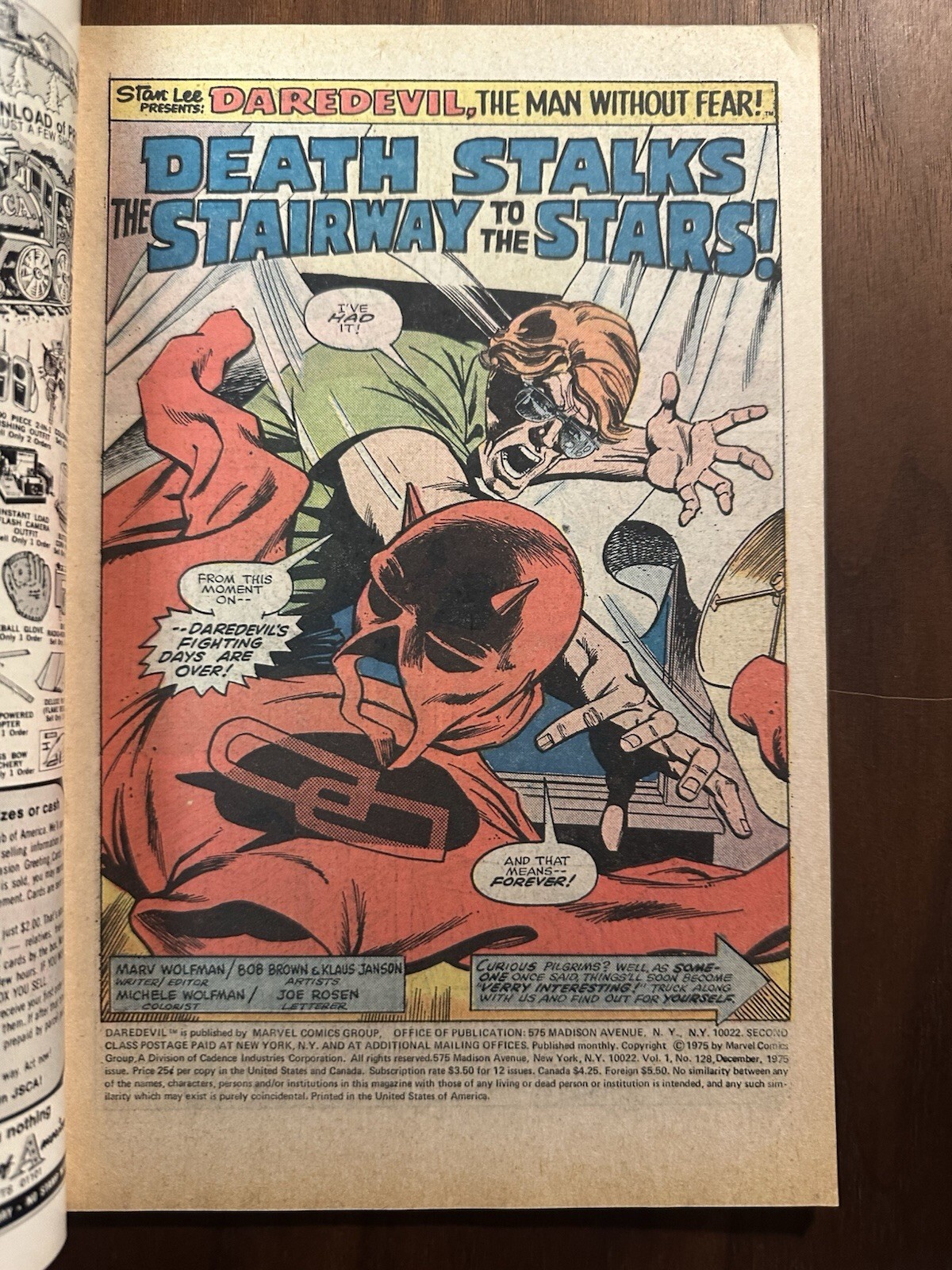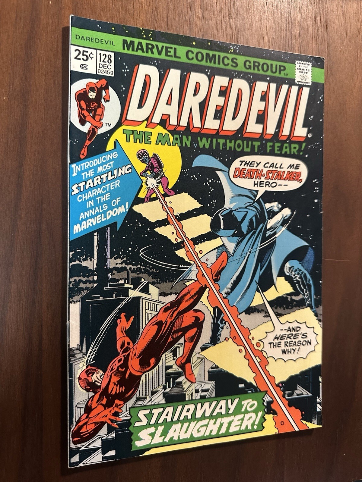 Grade: 6.0 Fine Daredevil #128 FN (Marvel 1975)Estimated Fine 6.0 condition. Please see pictures for more grading details.Cover pencils by Gil Kane, inks by Klaus Janson. Death Stalks the Stairway to the Stars!, sc ... Read More