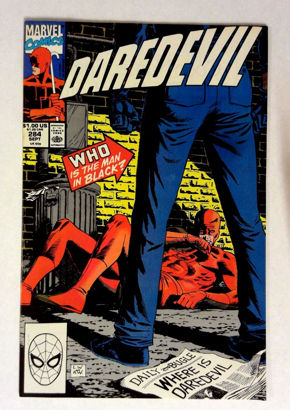 Daredevil #284 (1990) VF Daredevil Marvel Daredevil The cover features Daredevil sprawled on the ground as a mysterious figure stands over him, with the ominous question 'Who is the Man in Black?' The story involves Daredevil facing off against an unexpected adversary. The cover also displays the Daily Bugle headline 'Where is Daredevil'. TITLE: Daredevil ISSUE: 284 GRADE: VF SKU: VE-33-135Seller Information