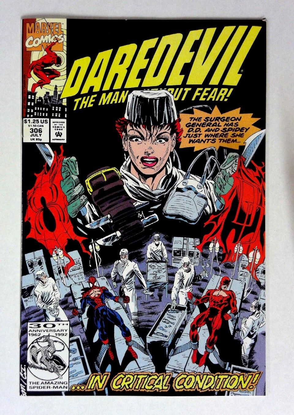 Daredevil #306 (1992) VF/NM Spider-Man Marvel Daredevil Cover features Daredevil and Spider-Man at the mercy of Surgeon General, who is depicted with surgical tools. The storyline hints at a critical operation where ... Read More